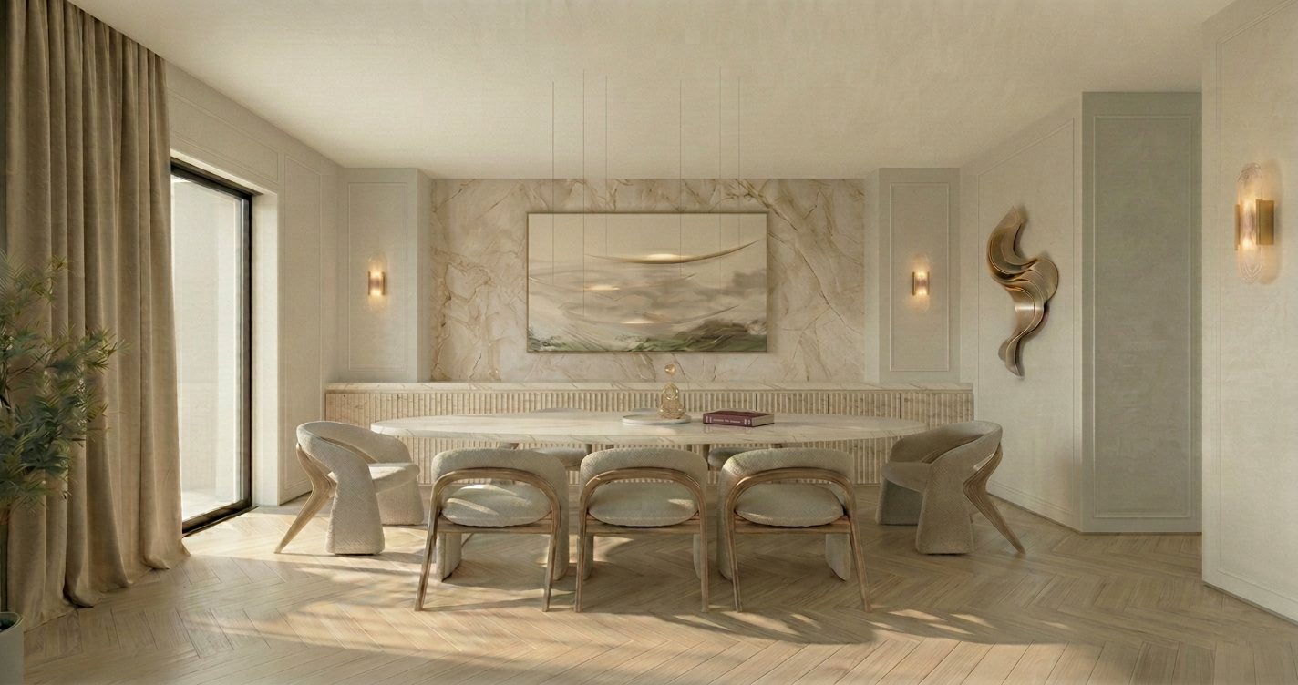 take this semi final render and enhance realism without altering any of the current image s geometry features or objects as well as image orientation no cropping zooming etc final result must be 4k do not add any new objects keep the herringbone pattern exactly as is but increase the tonal variation between individual planks each stave should have a distinct natural shade ranging from light sand to muted beige change the surface to an ultramatte raw timber texture with visible open grain removing all artificial sheen or plastic like smoothness the goal is to see a clear organic contrast in color from one tile to the next emphasizing its wooden nature yet making the effect visible yet delicate and so it doesnt stand out too much the goal is for the change from the original to be subtle and elegant make the waters of the travertine marble subtle although evident and elegant the goal is to be able to visualize the materiality while preserving the elegance of the composition