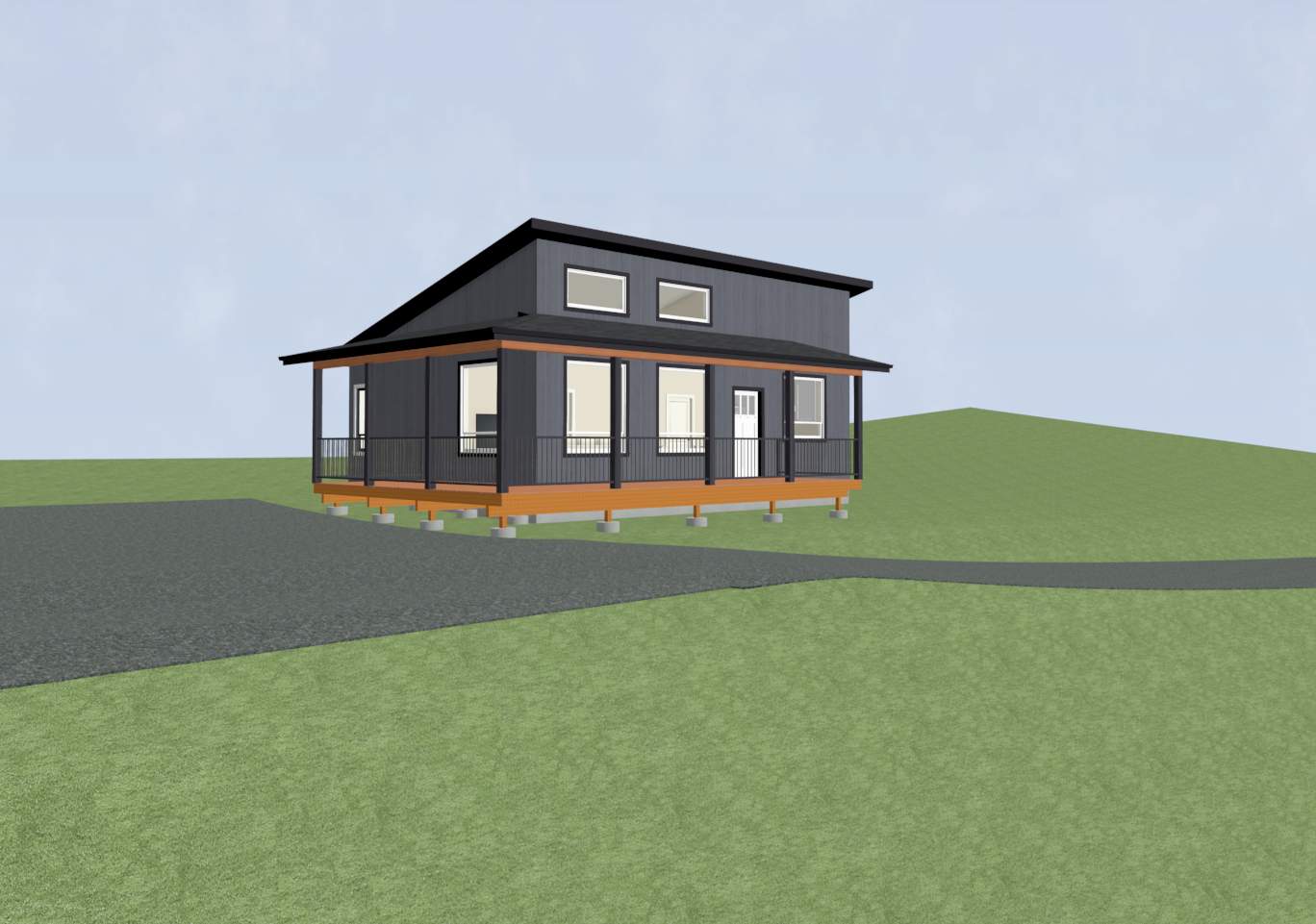 retain the existing structure and landscape terrain use modern craftsmen exterior styling with hardie siding and metal roofing composite decking and black steel picket railing with northwest kalama wa forest background white windows