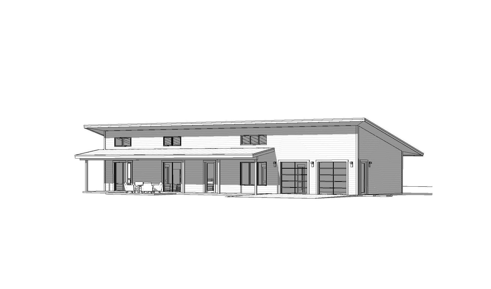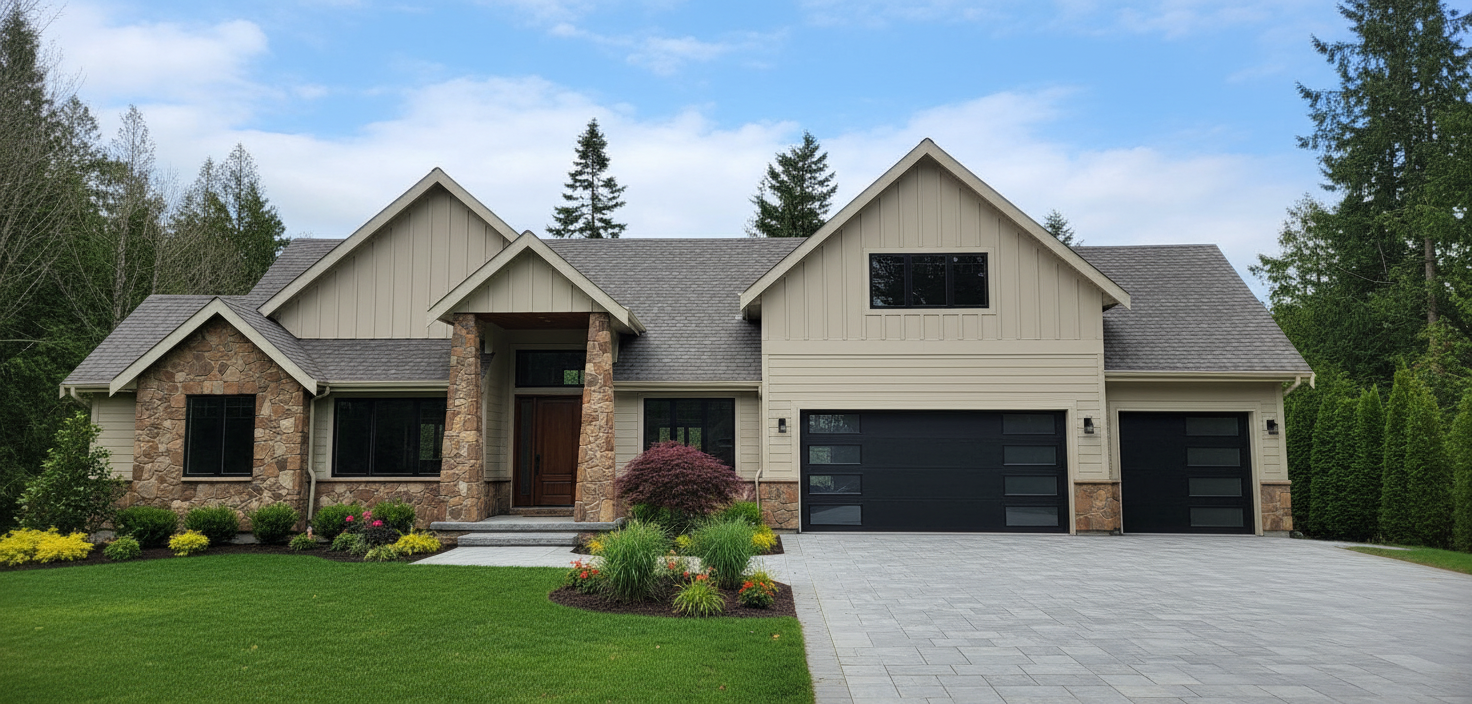 clean modern barndominium architectural exterior home rendered in cinematic vibrant dusk lighting with blue skies and vibrant clouds barndominium in a lush beautiful mountain setting with green grass and dense trees surrounding the property warm glow and reflections off of the windows select grade vertical white hardie siding green manicured landscape around structure with gardens and patches of grass black standing seam metal roof high fidelity photorealistic visualization crisp shadow falloff refined facade geometry soft atmospheric depth premium architectural photography mood ultra clean composition and materials photorealistic render black trim around the windows and doors prominent trees scattered around the property black window trim concrete driveway leading up to the garage doors