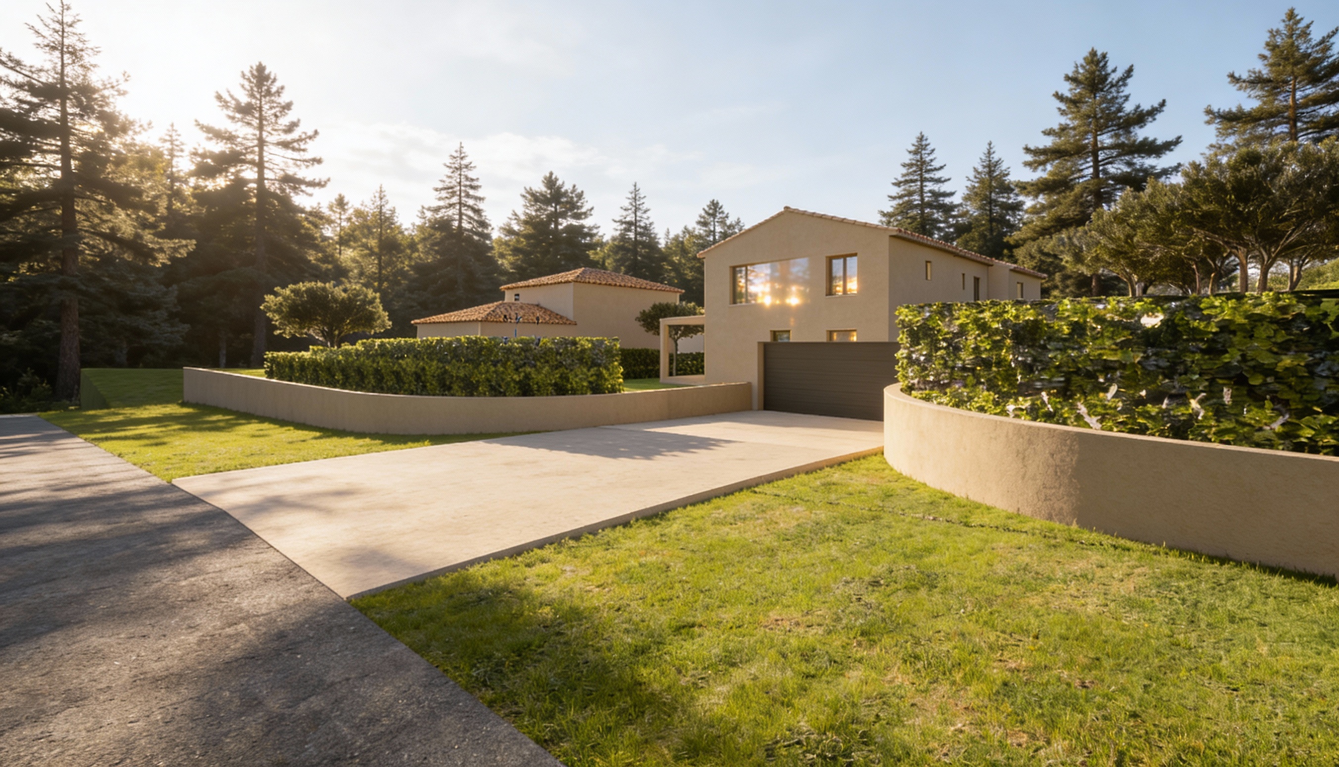 some mediterranean pine trees in the background reflects on the windows and lot of sunlight the vegetation hedge is composed of lilas and laurels the gate is non reflective metal