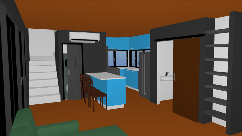 this is the main living space in a small modern home shot from above the couch towards the bathroom kitchen laundry room and the stairs to the second floor place a back lit mirror above the sink in the bathroom place some small decoration collectibles and family photos on the shelves to the right the ceiling and floor should be in a walnut plank with the walnut planks going left to right outside the windows in the kitchen should be spruce and pine trees with golden hour lighting