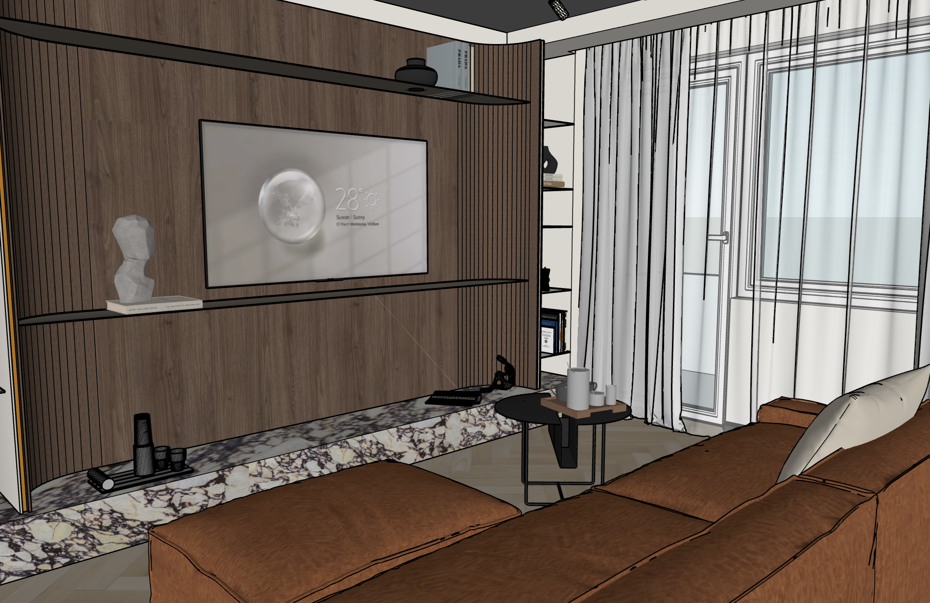 designer intent this render must communicate authorship this space was designed with specific intention your task is to make that intention visible and undeniable spatial composition the proportions are deliberate every void gap and negative space is a design decision preserve and emphasize it empty space is not emptiness it is part of the design the relationship between volumes must read clearly foreground mid ground background layers visible and distinct do not fill space do not balance composition artificially asymmetry and tension are intentional materials chosen for their biography not their category each material in this space was selected for its specific texture aging quality and physical character not as a generic placeholder render each surface as if it is the only surface in the image wood grain this specific wood not generic wood stone veining this specific slab not generic marble fabric this specific weave weight and nap not generic upholstery authenticity over perfection a material with history is more valuable than a material that looks new and synthetic execution detail precision is the signature joints edges transitions between materials render with physical accuracy these details prove the design was buildable and built well where two materials meet show the decision the reveal the shadow gap the overlap these are not accidents finish quality matte vs satin vs polished must be clearly distinct and physically correct emotional brief four simultaneous responses the viewer must feel i want to live here warmth and desire the viewer must think who designed this authority and distinction the viewer must sense i have not seen this before genuine uniqueness the viewer must trust this was built precisely as designed competence camera intention frame what the designer sees not what a camera sees the composition must reveal the spatial logic not just document a room frame the primary material relationship the most important material dialogue in this space should be the visual anchor of the image one clear hierarchy one surface one detail one spatial moment that carries the entire design intention portfolio grade this is not documentation this is authorship architectural digest meets analog photography meets design monograph tactile precise unmistakably someone who knows why authorship visible frame the most important material relationship in this space make every surface read as deliberately chosen not generic this design has a signature make it visible
