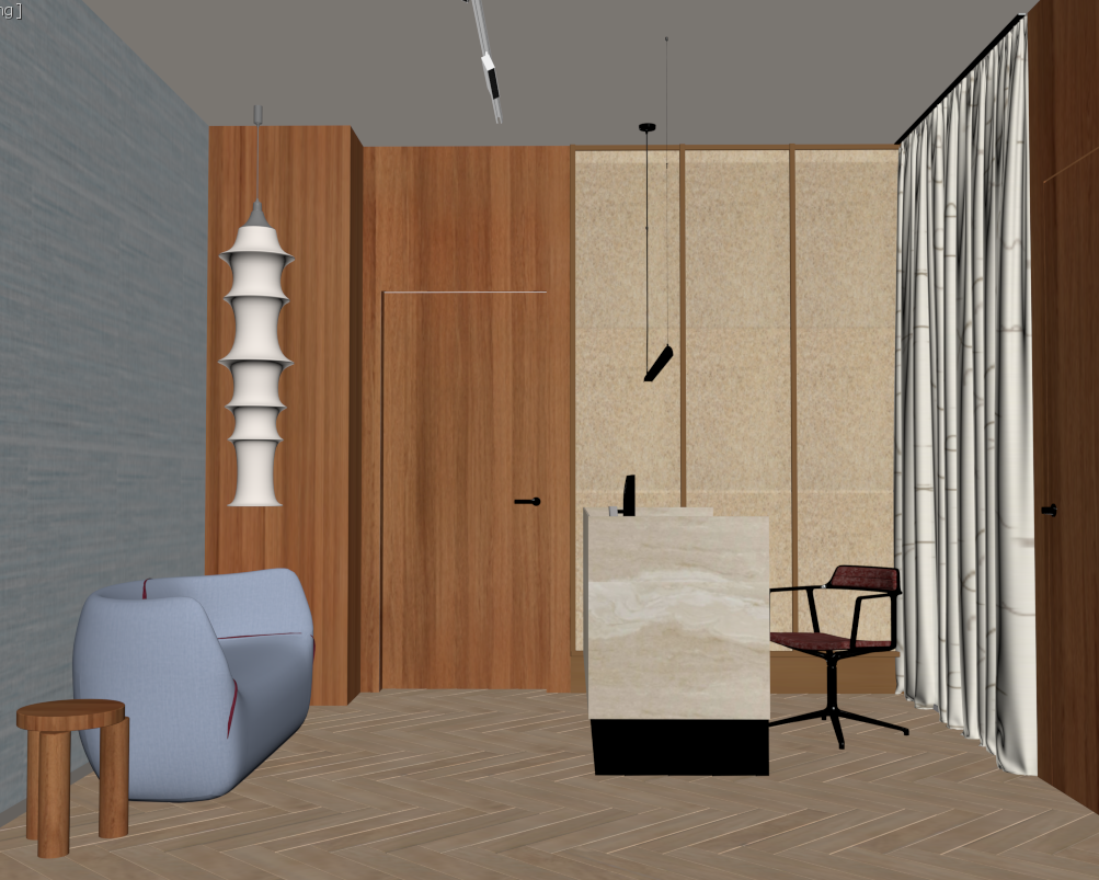 ultra strict hard lock prompt counter curtain full scene no enhance details absolutely do not modify geometry or modeled elements do not move scale reshape replace remove or reinterpret any object architectural component furniture fixture material or texture all changes are strictly limited to improving render quality pbr material fidelity shading lighting global illumination soft shadows ambient occlusion and color balance counter made of natural stone strictly preserve the exact original stone pattern veining coloration and surface appearance as in the reference visualization do not smooth enhance stylize or reinterpret the stone the lower base trim of the counter is made of steel fully visible and separate from the stone render with physically accurate brushed metal properties subtle reflections correct roughness restrained non mirror finish walls right wall wood wool acoustic panels light natural wood tone fibrous slightly rough porous preserve original layout and detail floor natural light oak herringbone parquet classic jode ka strictly preserve plank layout proportions direction and pattern matte natural appearance only behind the chair glass panel intact and unmodified beige curtain located behind the glass panel opaque and non transparent do not move it in front of the glass or add translucency it should appear as a solid textile surface with no sheer effect and no light passing through lighting pendant lamp above counter radent pendant lamp by gejst direct downlight and subtle uplight via perforated metal mesh left side falkland lamp by artemide soft diffused ambient light calm and even a small amount of indirect daylight enters through a window not visible in the camera view diffused and subtle artificial lighting remains primary illumination neutral and controlled materials all materials should remain physically accurate pbr correct roughness reflectivity micro details texture resolution and realistic light interaction do not alter reinterpret or stylize any surface pattern or texture do not alter any geometry modeled element or detail only improve render quality material accuracy and lighting the final render must be high end photorealistic with perfectly preserved geometry patterns and details including the exact position of the curtain behind the glass and improved realism in lighting materials and image fidelity