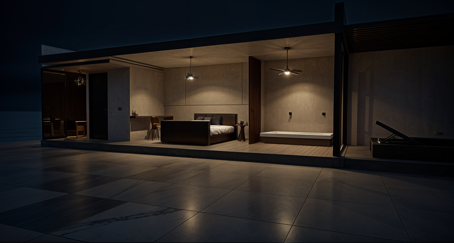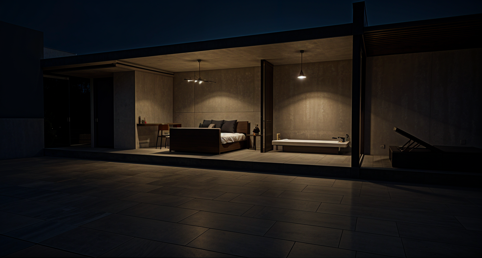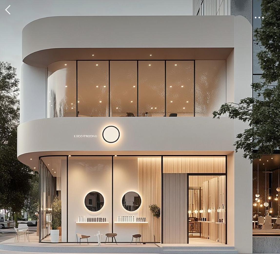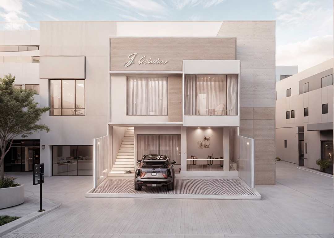 exterior shot create a modern architectural rendering of a minimalist two story building with large windows the exterior walls are pure white complemented by sleek black accents around windows and doors the windows feature transparent glass with subtle reflections the driveway is a dark gray smooth concrete add a luxurious black suv parked on the driveway illuminate the scene with soft ambient sunlight creating a warm welcoming atmosphere include a clear light blue sky as the background for a fresh and crisp ambiance on the left and rigth there is a garden with shady trees the writing on the wall above is j pilates it glows warmly the second story is pilates studio