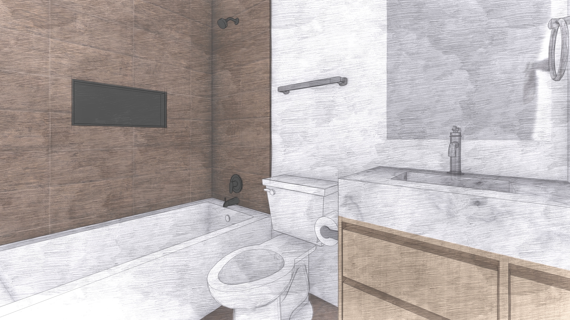 cabinet panel use desert oak veneer flat panel slab countertop use volakas white floor tile use tune desert shower wall use rectangle tune mosaico linea ivory wall paint use harvest moon black towel rack and faucet black ream around mirror no window on tub wall it s niche add fixed half glass at tub big rectangle tile on floor use same tune mosaico linea ivory tile at niche