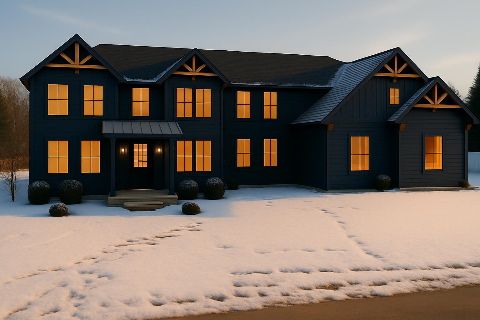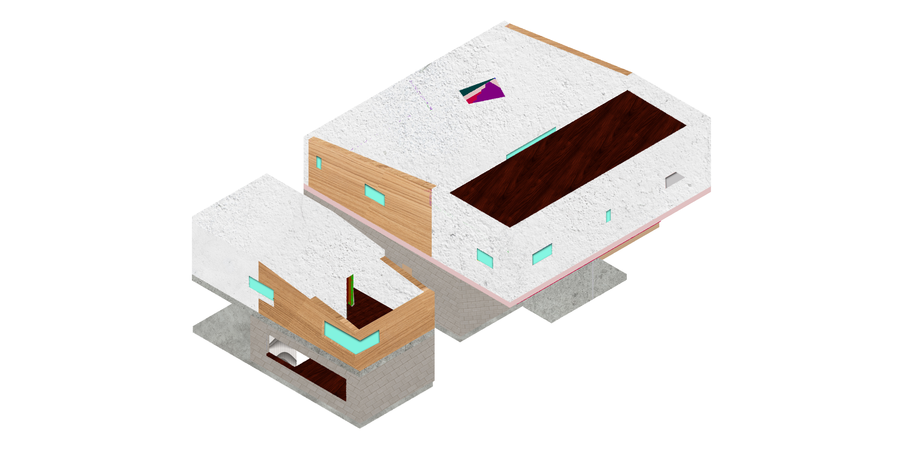 please render these two houses to look more photorealistic without changing the dimensions the materials are stucco white areas glass light blue areas concrete cmu and wood