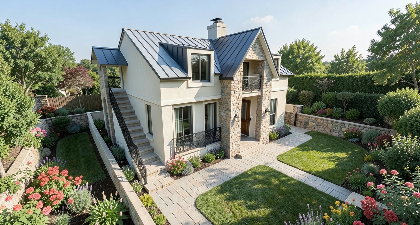 make as photorealistic as possible while keeping textures the same as selection professional landscaping in indianapolis indiana with good lighting match materials to plan and remove any text vertical siding color and trim to be 626366 moire black roof by certainteed black soffit and fascia black windows front door color sw9112