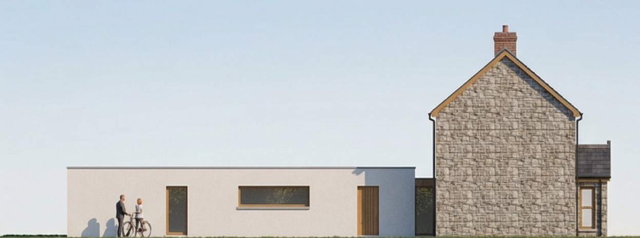 photorealistic with trees and shadow with amazing drop of views over mountains house is high up and view is overlooking to left of building