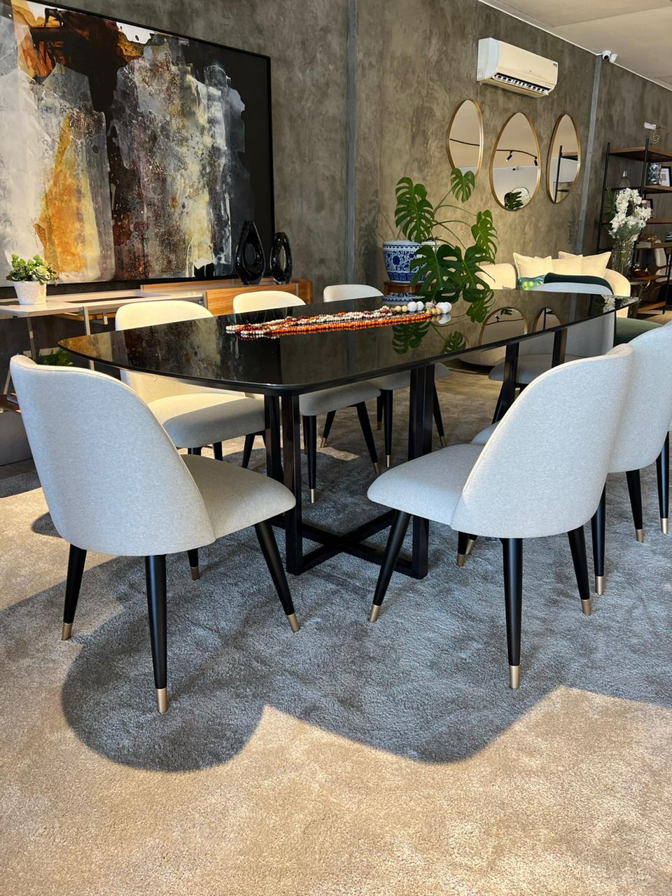 a modern style dinning room the living room features light gray walls and wall paper warm decorations and modern art paintings adding layers to create a bright and comfortable atmosphere ultra high resolution and ultra fine details 4k picture quality the style is modern light luxury
