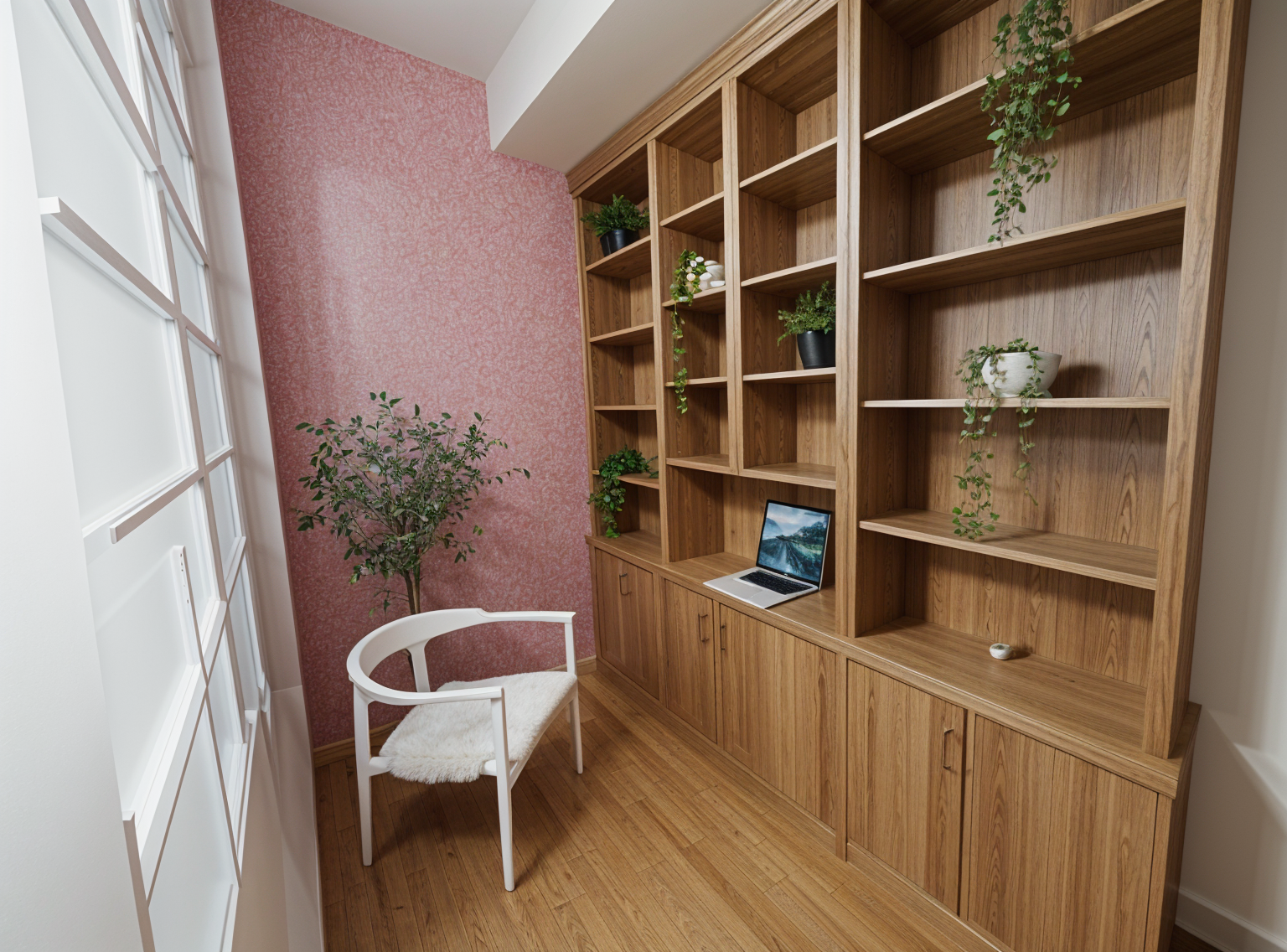 make the striped wallpaper watercolor flowers make the chair fuzzy white boucle make the cabinets modern white oak