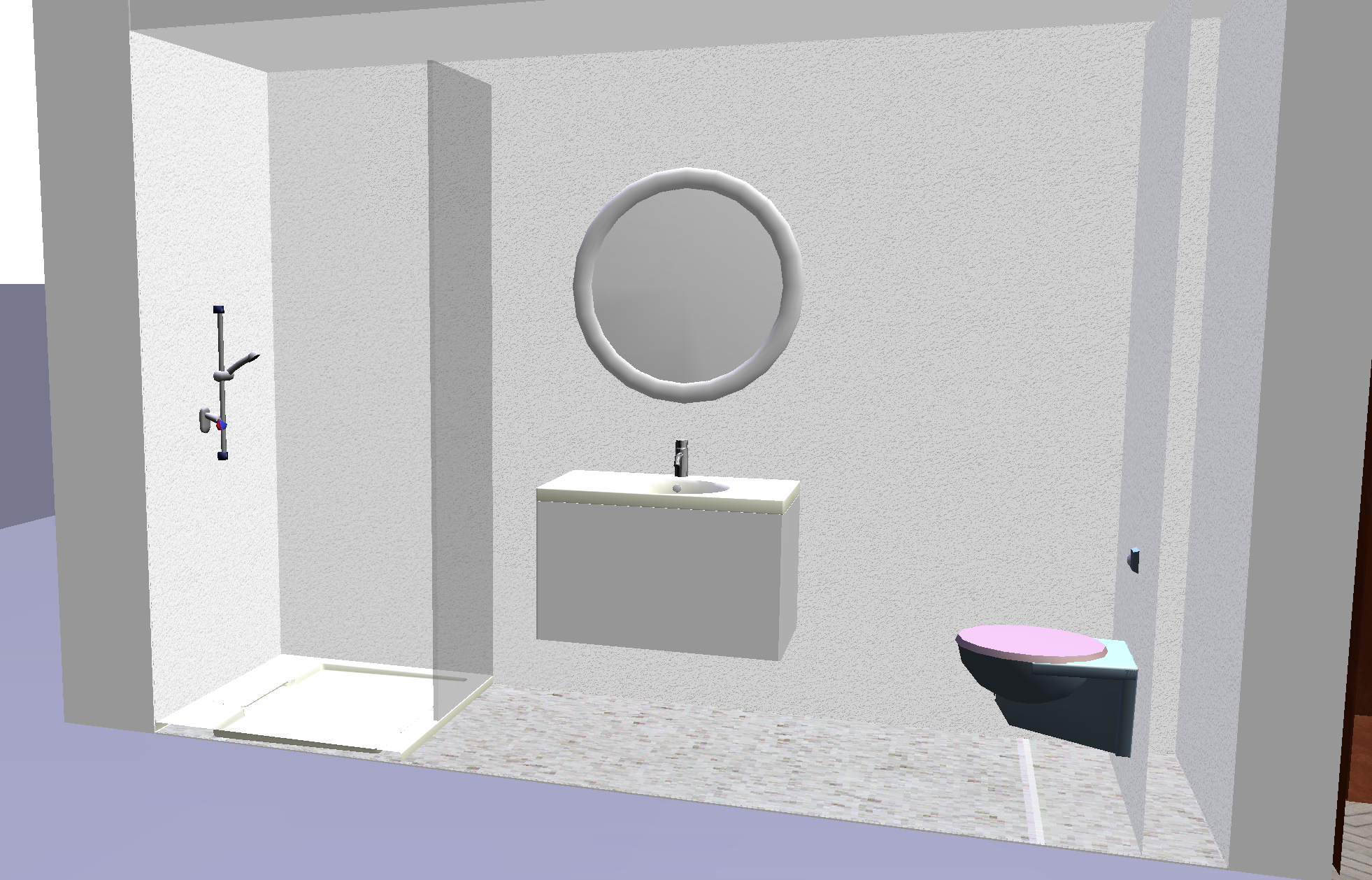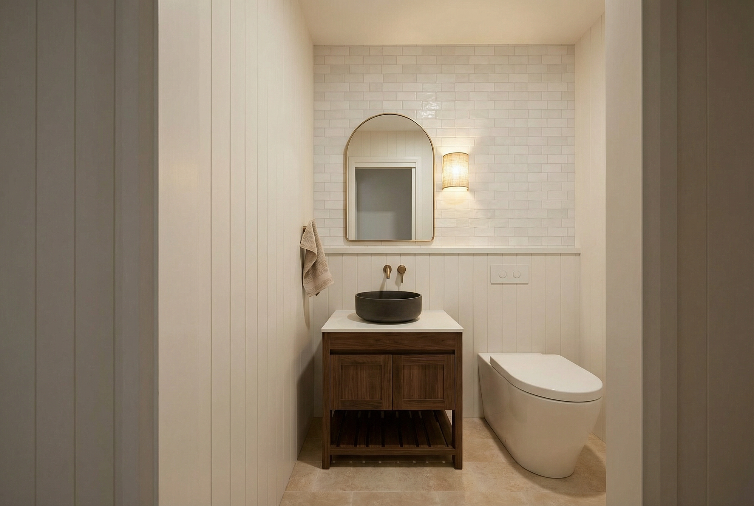 genau dieses rendering berarbeiten fotorealistisches innenraum foto exakt dieselbe perspektive und kameraposition wie das hochgeladene referenzbild 100 identische raumgeometrie exakt gleiche m belanordnung weiches nat rliches tageslicht leicht schr g einfallende sonne raum k nstlich ausleuchten sanfte realistische schatten blickrichtung ist nach osten sonnenlicht kommt von s den realistische materialien echte holztexturen stoff mit leichten gebrauchsspuren hochwertige oberfl chenreflexionen lavabo aus marmor collemandina grigio in braungrau dunkel dahinter eine vola wandarmatur edelstahl vollkommen rahmenloser und hinterleuchteter spiegel links neben dem lavabo ist die dusche thermostatmodul axor select mit stabhandbrause und grosse wandtellerkopfbrause w nde und boden in der dusche collemandina grigio in braungrau alle anderen sichtbaren w nde sind sichtbeton moderne toilette wandh ngend in farbe sabbia sehr moderner minimalistischer look nat rliche farbwiedergabe das bild muss wie eine professionelle fotografie aussehen es soll ein echtes und reales foto sein canon eos r5 35 mm festbrennweite f 2 8 hyperrealistisch dslr qualit t raw aufnahme 8k aufl sung extrem scharf perfekte tiefensch rfe professionelle architekturfotografie