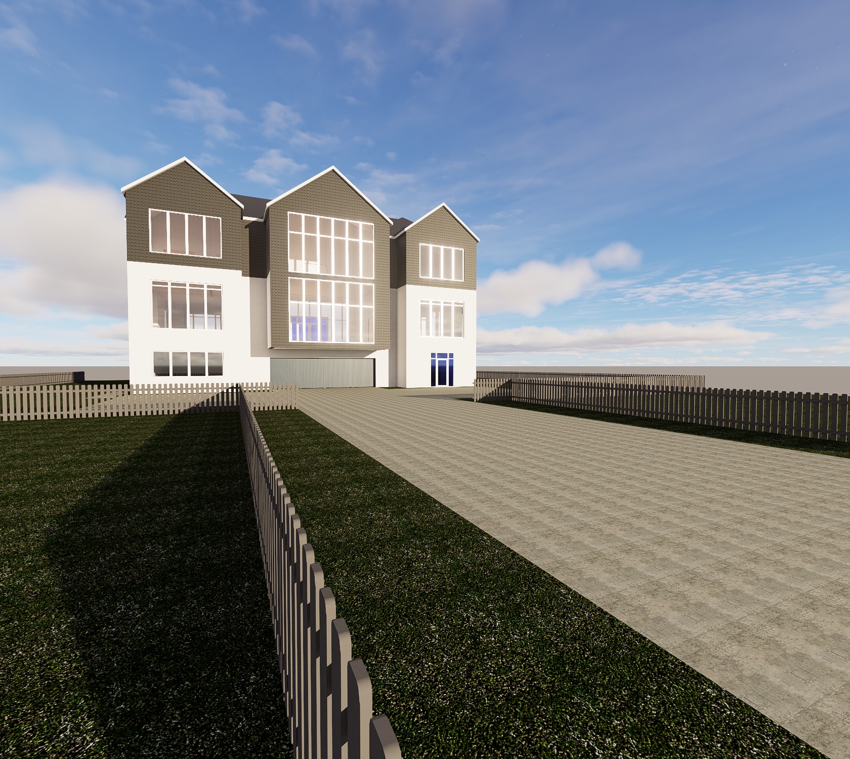 photorealistic architectural rendering of a modern farmhouse barndominium with metal siding wood accents and large windows warm golden hour sunlight soft shadows realistic materials high detail architectural photography landscaped yard with grass and trees subtle sky cinematic composition clean and professional out front please put a couple cars and some people the middle door is a garage door and the door on the far right is the front door please ensure the proportions are accurate to the original image i provided