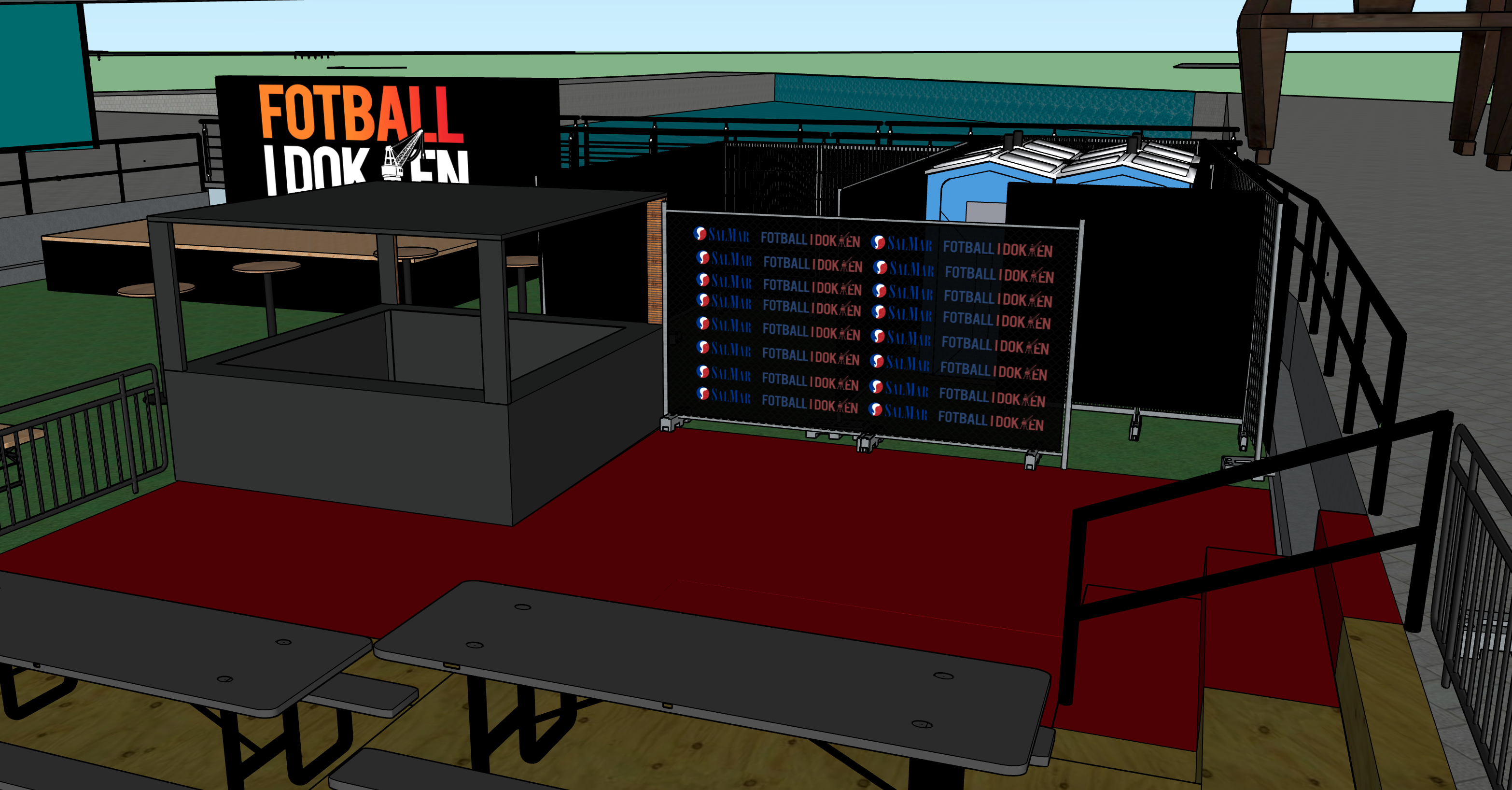 prompt ultra realistic architectural event visualization of the vip entrance for the football world cup fan zone fotball i dokken main focus is the vip branding wall on the right with repeating salmar logos and fotball i dokken logos clearly readable sharp and well lit a line of well dressed vip guests standing along the vip wall posing for photos smiling social people taking pictures of each other in front of the branding wall photo moment atmosphere bar area on the left is active bartenders serving drinks people standing at the bar with beer and wine relaxed but premium vip vibe ground surface is artificial grass fake turf clean and perfect no weeds no dirt clearly not natural grass right side is a pedestrian walkway no water with people walking past some stopping to look toward the screen area lively crowd movement scene feels busy energetic and social but realistic and credible evening golden hour lighting warm light sources soft shadows subtle cinematic contrast high realism natural proportions correct human scale do not change any dimensions placements or geometry from the sketchup model do not add tribunes stages water extra structures or new elements enhance materials lighting people atmosphere only professional sponsor ready visualization intended to present salmar as a premium title sponsor