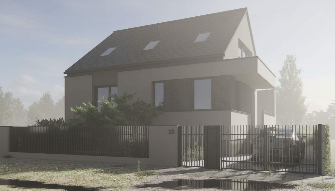 zaha hadid exterior shot imagine a modern two story house with a dark gray steep roof and a rubbed dark cappuccino and darker gray beige plaster and dark gray brick inserts matching the roof color between the windows on the right which are set back 4 cm from the plane brick exterior walls the mood is gloomy yet calm with soft lighting and a slightly dramatic sky the house is surrounded by lush green foliage which contrasts with the elegant black silk gloss metal fence and gate in the foreground the sidewalk in front of the gate is a bit neglected but the arrangement in front of the fence and behind the fence is new clean and tidy a medium sized car is parked in the driveway the preserve the peaceful suburban environment in the background further behind the house family houses with a central european feel the neighboring area to the right of the house is completely empty a little weedy with smaller trees a gravel path with scattered overgrown grass in front of the gate the sidewalk is a little neglected slightly weedy after rain mood with a few small puddles in which the house is standing the sky is cloudy with filtered cheerful sunshine that creates lattice shadows make an ultra realistic rendering with a little more muted normal lights architecture