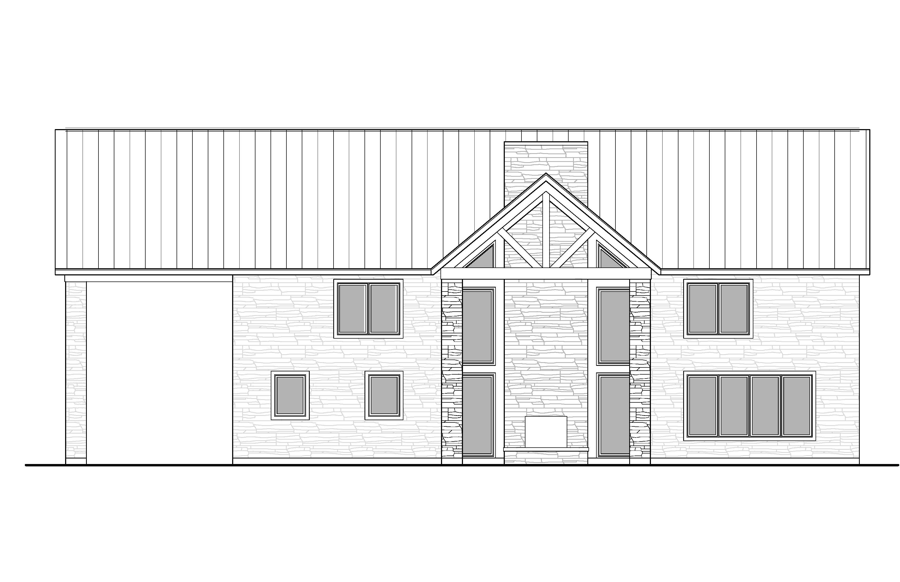 create photo realistic perspective of home with medium grey stones black trim black metal roof and warm wood timbers in a wooded setting with lots of vegetation