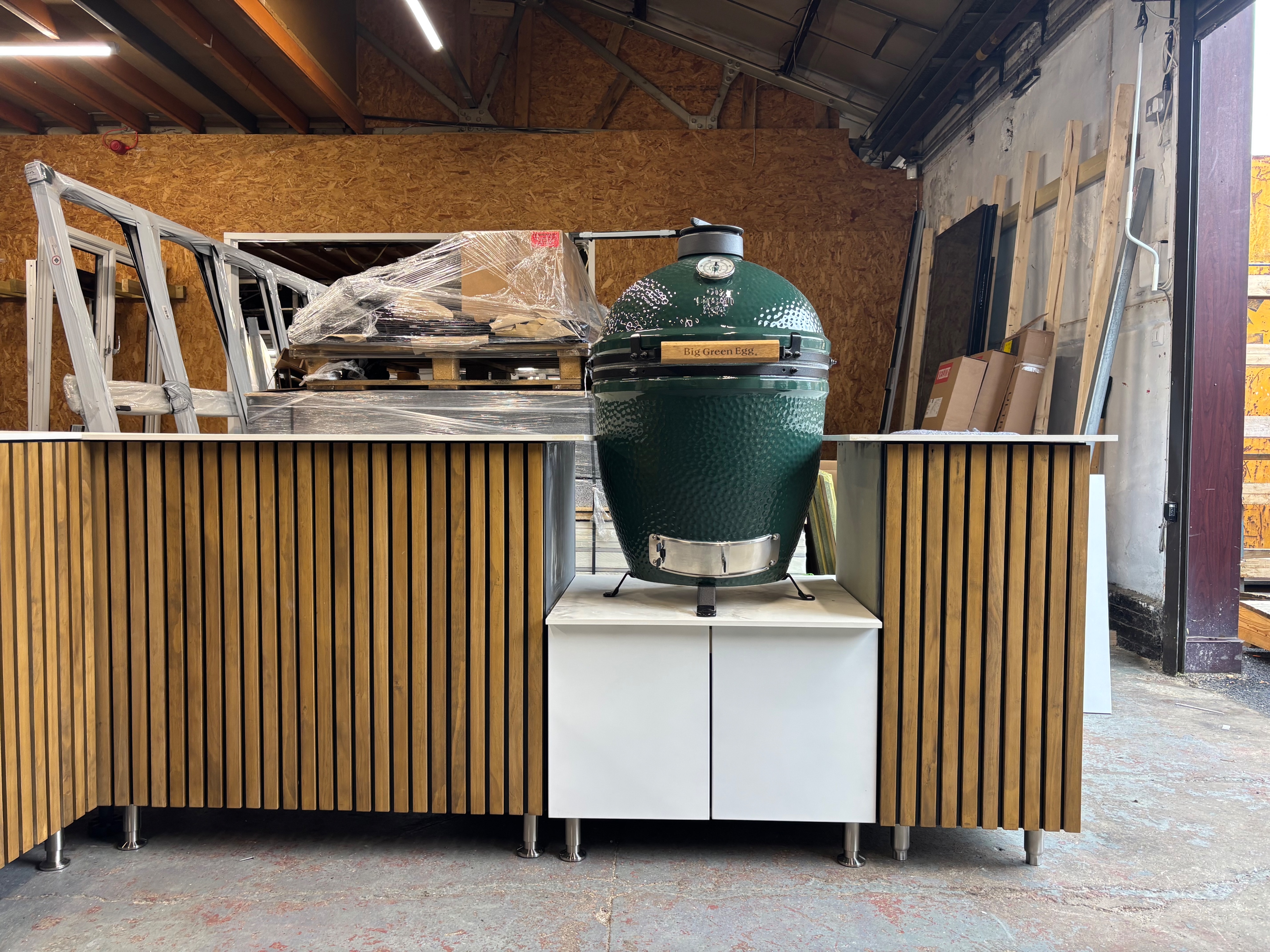 a well arranged workshop with a pristine green ceramic grill as the centerpiece the grill stands on a sleek modern counter with vertical wood panels in warm honey tones metal warehouse beams in soft silver stand in the background and stacks of materials wrapped in plastic appear neatly ordered the atmosphere is cozy and industrious with warm ambient lighting highlighting natural wood textures and the grill s glossy surface the scene feels inviting yet practical evoking a sense of precision and craftsmanship amidst earthy tones and metallic elements