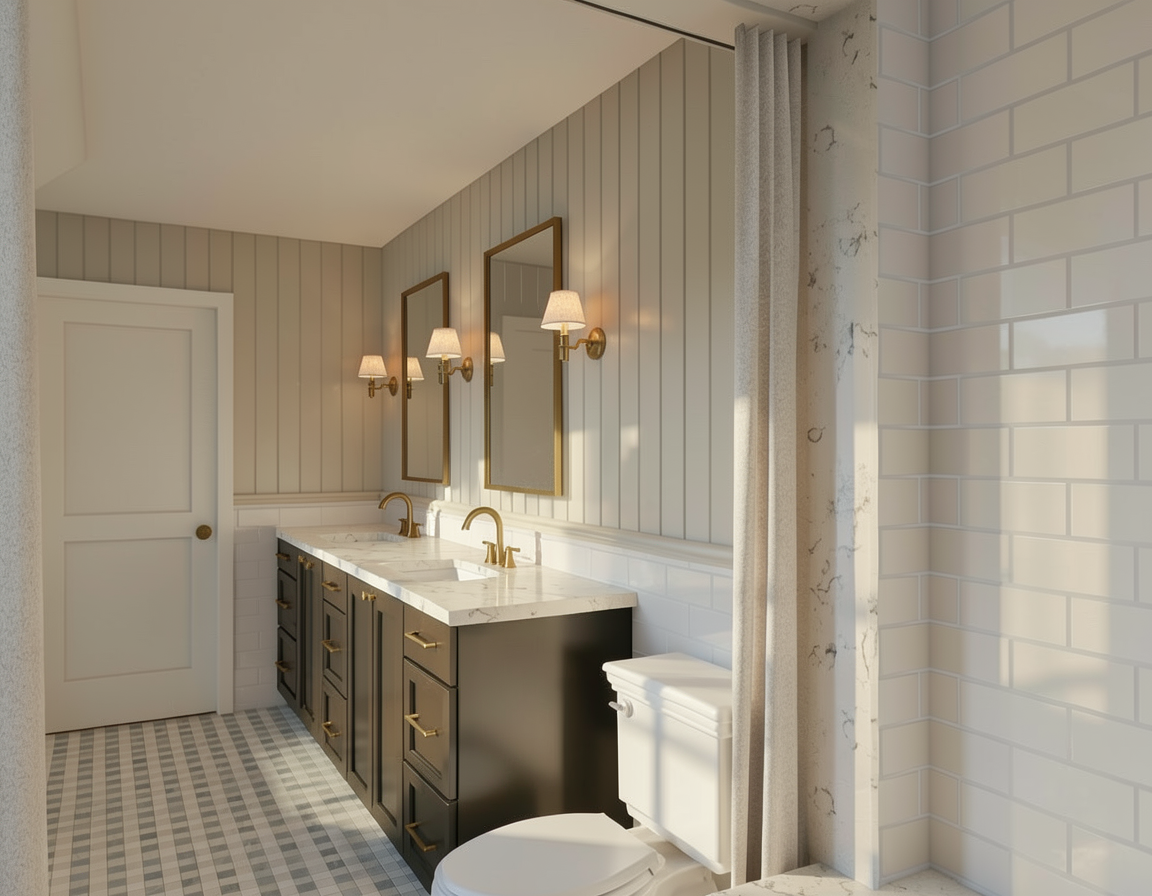 this in montana use native montana trees and vegetation make siding ghost wood like jackson hole keep rock on small gable bump out make golden hour outside show golden light coming from inside make roof copper standing seam roof make concrete on foundation rock material do not change the shape of the structur or window sizes the timber trusses do not have webs just one king post there is rock slab patio on left side of porch