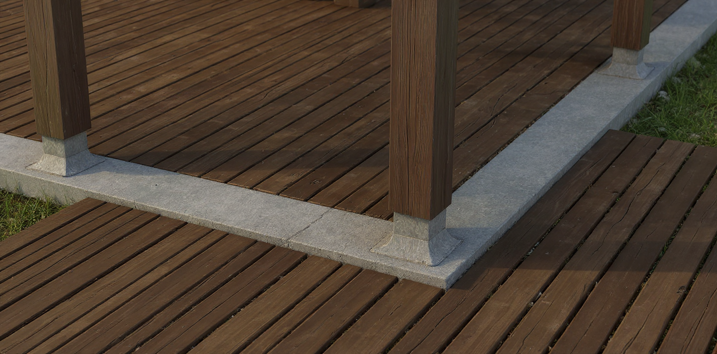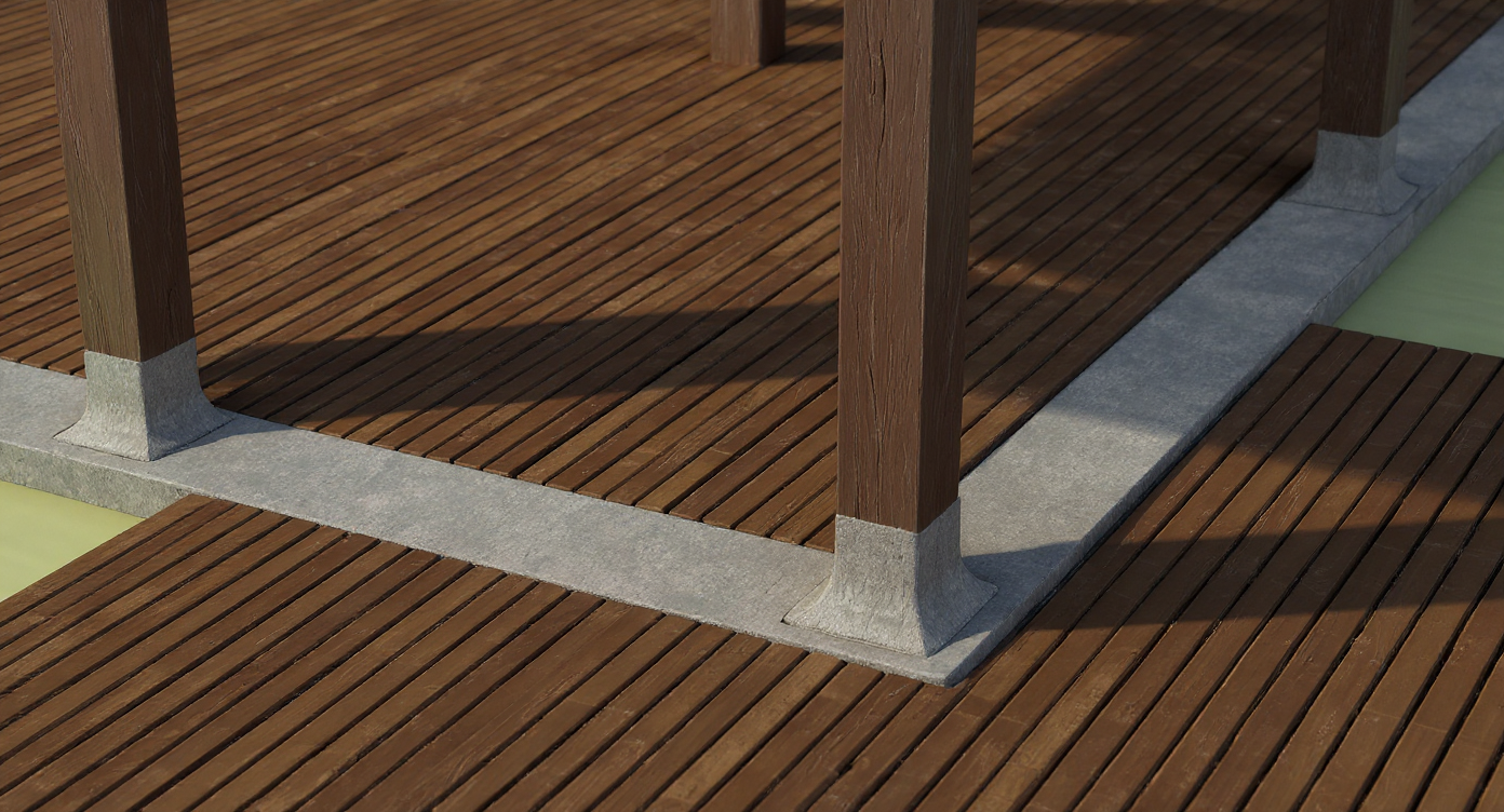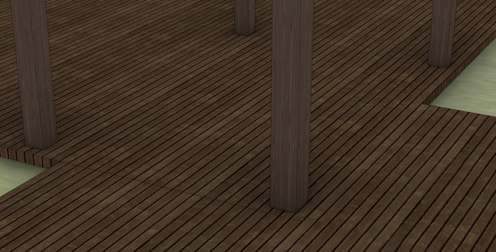 hd render of a flooring threshold detail of a pavilion oudoor foreground is narrow wooden decking wooden columns made of eclaimed timber dark black colour columns to show defect grooves and rustication the flooring in the background is narrow wooden planked flooring decking to be perfectly consistant all decking likes perfectly aligned