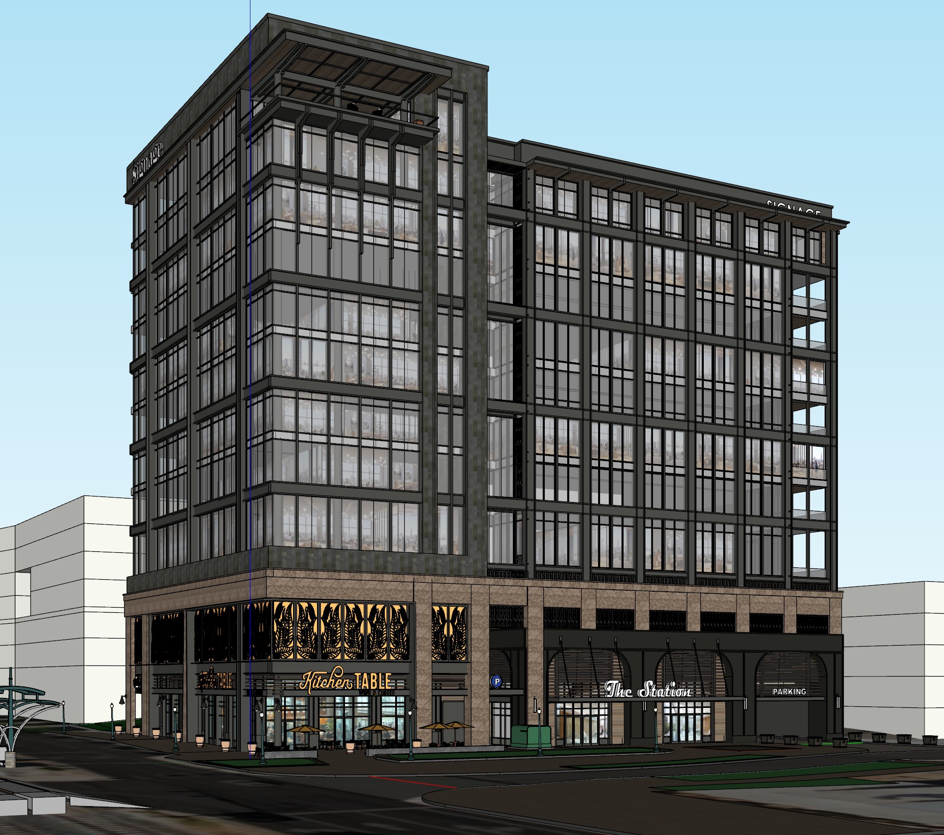 mixed use retail tenant with soft backlit laser cut panels at parking levels