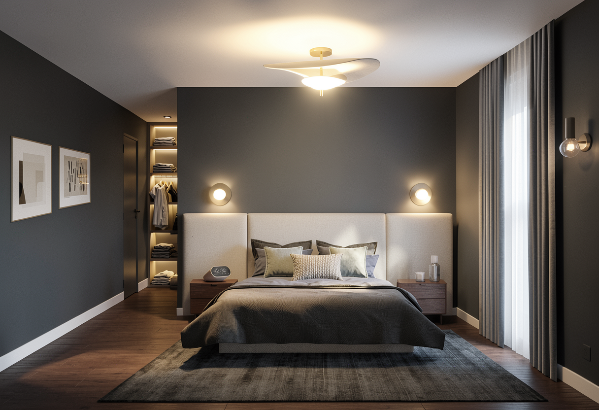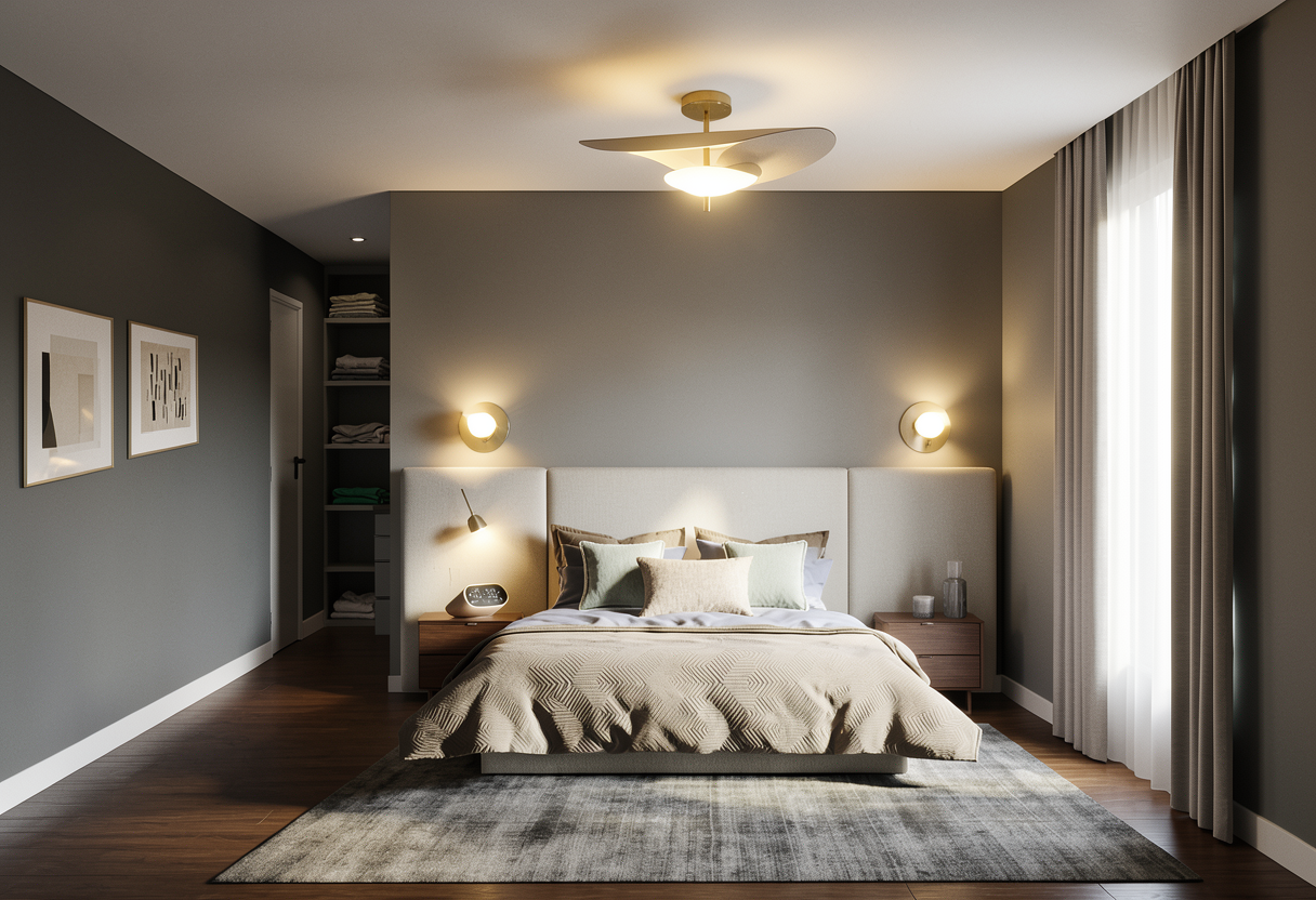 render my image add a soft and warm light source to the ceiling light and the wall sconces add folded clothes to the shelves in the back