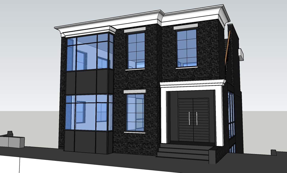strict do not break maintain exact building geometry massing proportions window door locations framing and camera perspective from the input revit model do not alter rooflines openings mullion patterns or entry proportions no added elements that change architecture project context modern urban residence located on a steep hillside in mount adams cincinnati ohio the home overlooks downtown with elevated city views primary materials very important exterior walls dark charcoal black brick matte finish subtle variation not glossy entry surround portico white stone surround limestone look smooth honed finish clean modern joints not painted trim window frames black aluminum steel lower level corner glazing maintain as modeled dark metal panels glass no additional materials introduced site context mount adams hillside steep sloping site condition house stepping with grade background cincinnati skyline view soft depth of field but recognizable city buildings foreground minimal landscaping clean modern do not overdo plants retaining edges subtle and integrated into grade concrete or stone steps leading to entry lighting atmosphere time golden hour sunset warm interior glow visible through windows soft exterior shadows enhancing depth of brick stone slight atmospheric haze over city for realism rendering style photorealistic but clean not overly stylized sharp edges crisp lines realistic reflections in glass subtle not mirror like keep material contrast strong black brick vs white stone camera maintain provided perspective slight depth of field toward background city