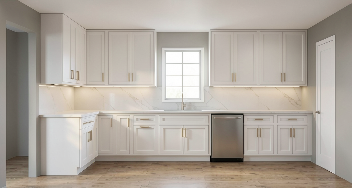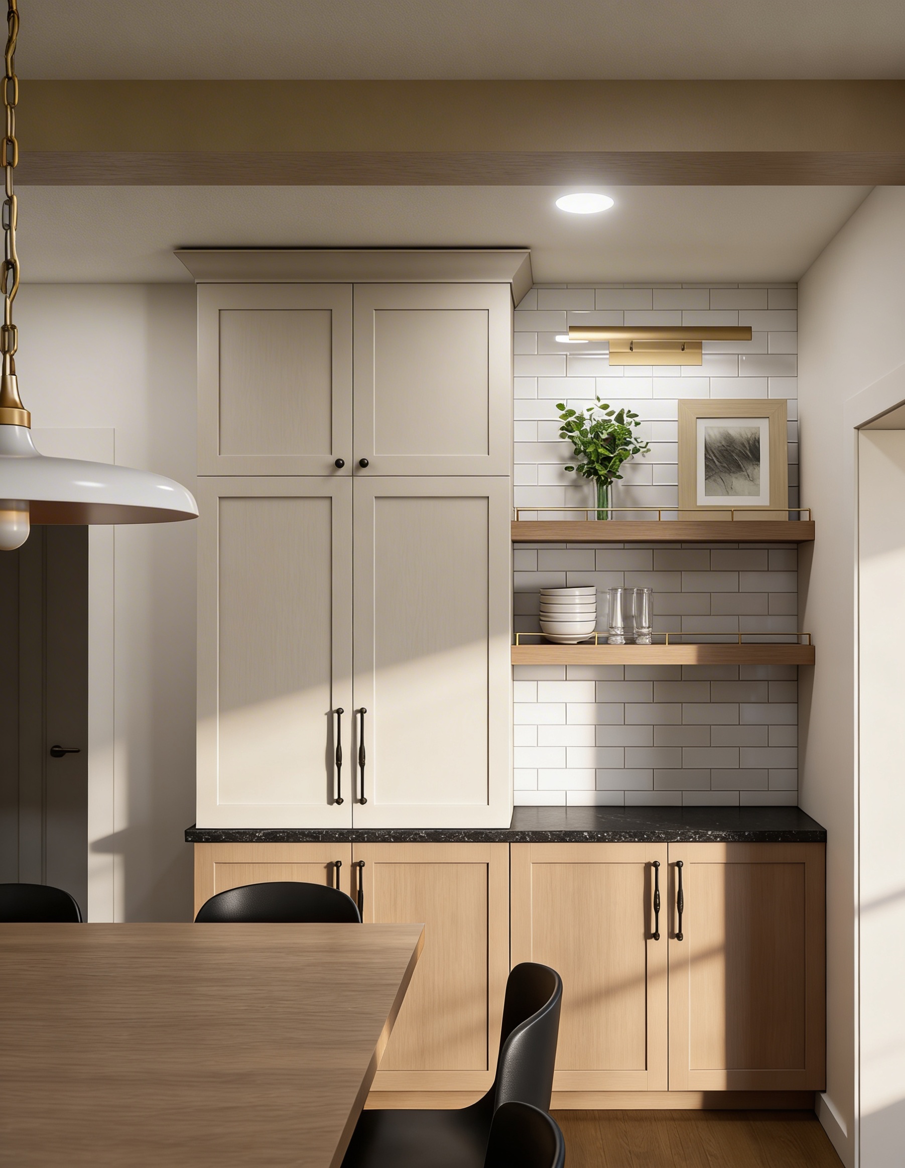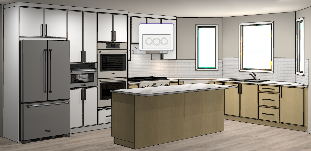 render a modern kitchen interior featuring stainless steel appliances and sleek white cabinets with black handles lower cabinets are light maple with black handles the kitchen island should have a smooth white marble countertop and warm light maple wood lower cabinets the backsplash consists of white subway tiles the overall atmosphere is bright and inviting with neutral beige walls and large windows allowing natural light to flood in creating a soft and airy ambiance the floor is a light natural wood adding warmth to the space the windows overlook a springtime meadow with gently rolling wooded hills in the background in late afternoon sunlight