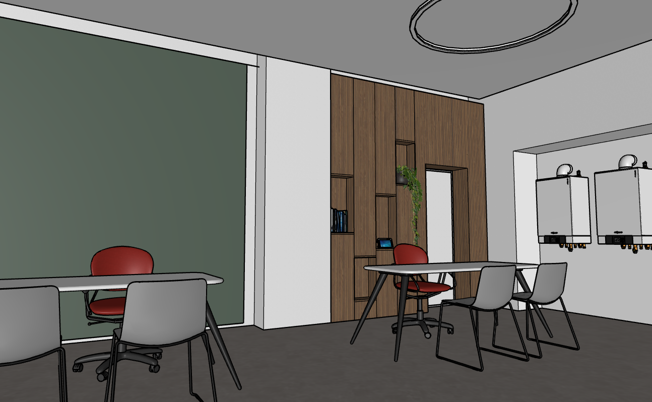 create a high definition photorealistic 3d render do not change the materials use artificial lighting with a color temperature of 3000k the materials text and furnishings must remain exactly in their original positions and proportions but appear more realistic place two people sitting on the chairs facing each other