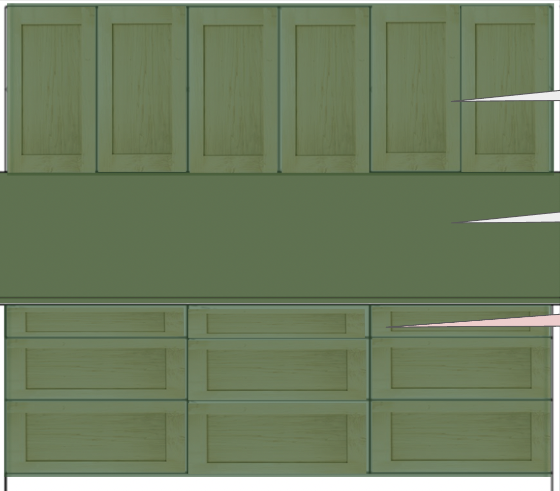 render this dark green stained cabinets with visible grain with 2 inch green circle knobs on all cabinets stainless backsplash and stainless countertop add a some antique wooden bowls with fruit remove cooktop