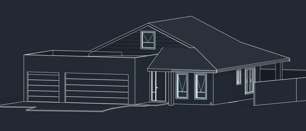 this external facade of this house is made up by rendered plaster the pop out box of the garage has a gray face brick finish the loft has a white weatherboard finish it has charcoal chromodeck roof sheeting it has a single and double sectional garage doors in black please add a car in the driveway