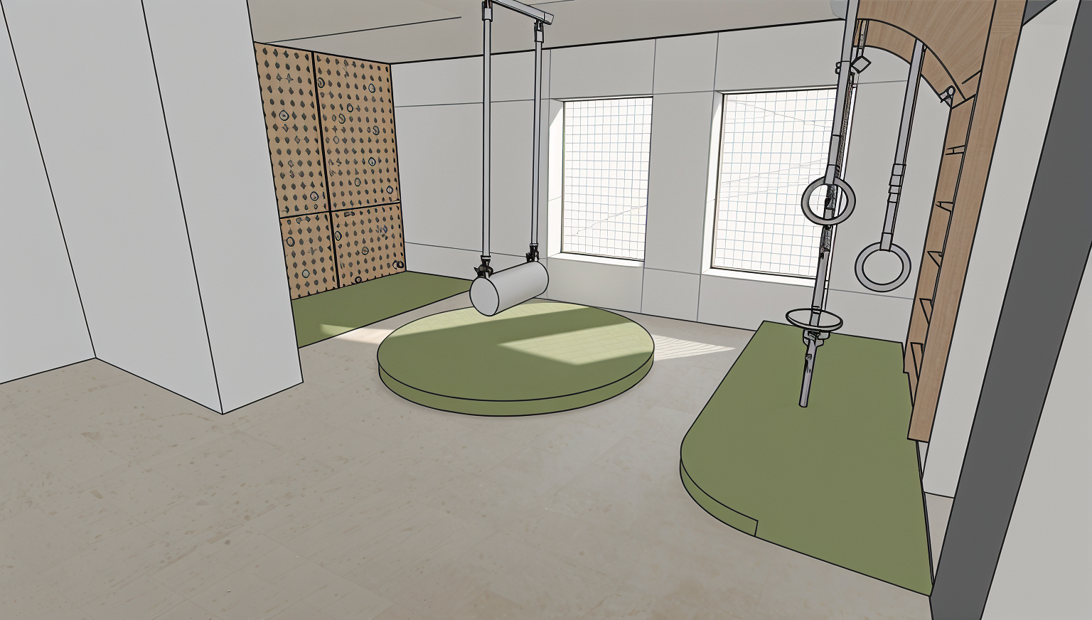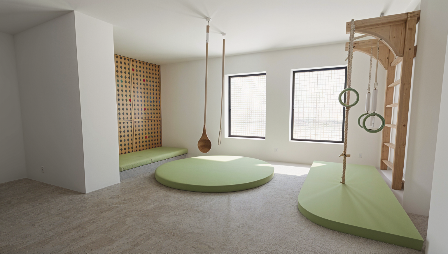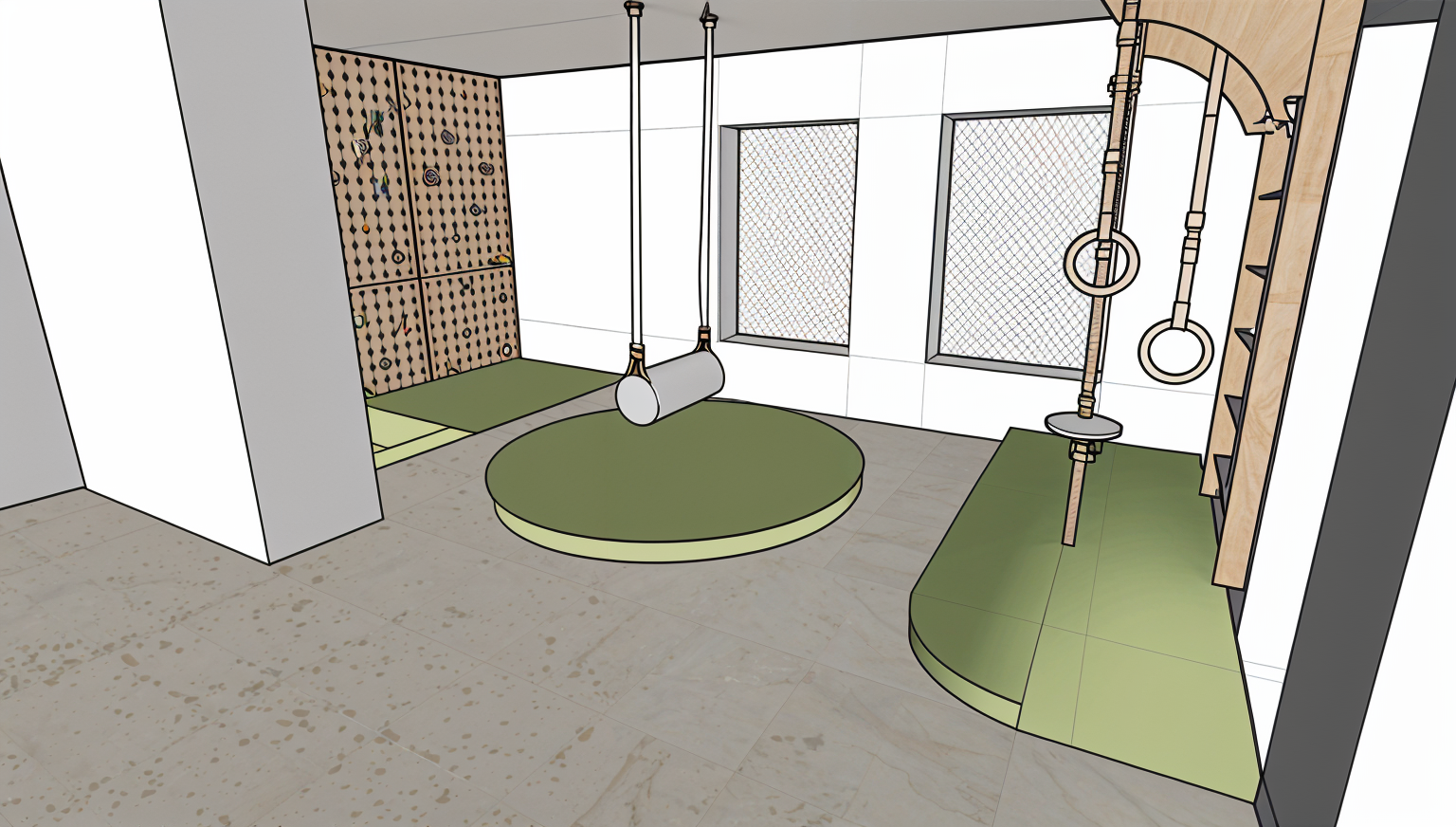 make it as real photo put windows put safety nets on the windows on the back wall there is a climbing wall wal have small holes to insert a fake rocks it is made from plywood floors are terrazzo linoleum put fake white rocks on the climbing wall put a swing above round mattress swing shape the same as my primary picture shows