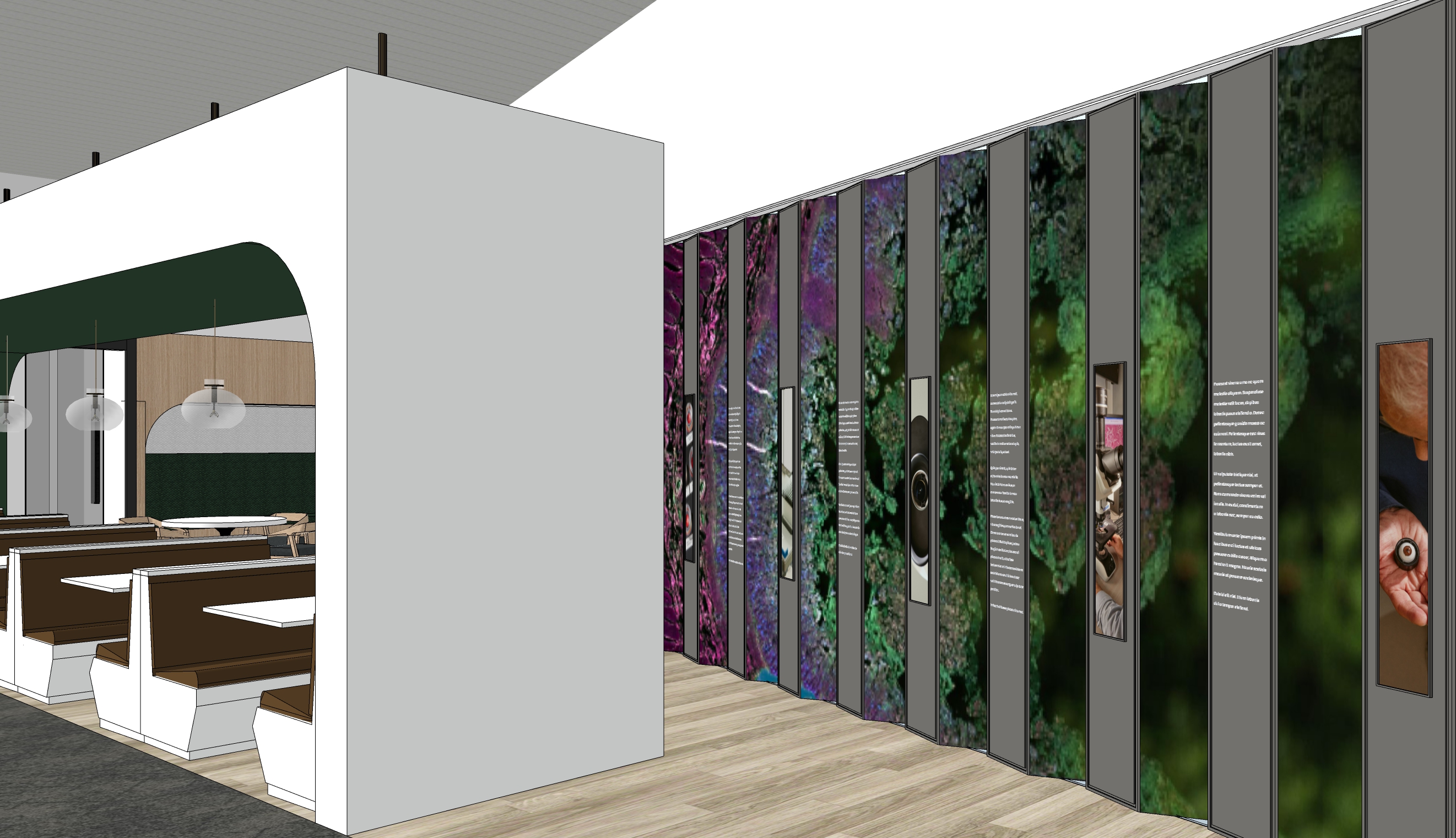 photorealistic interior white wall with a design featuring panels with text of various acrylic colors on one side and an image on another side of the panels the wall is lit up with soft warm lighting and overall environment is soft bright lighting