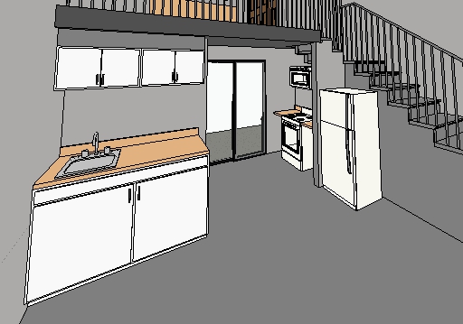 white ceiling and white walls exposed wood beam under railing black railing cabinets to be painted duke blue add cabinets to sides of oven and microwave floor is concrete add pool in backyard