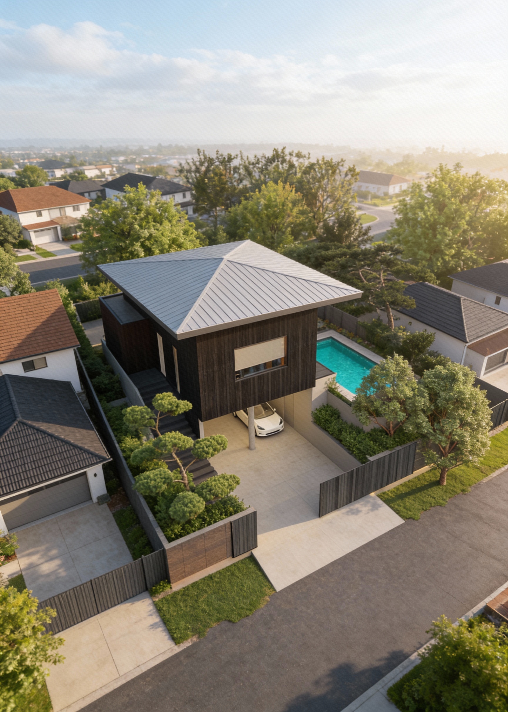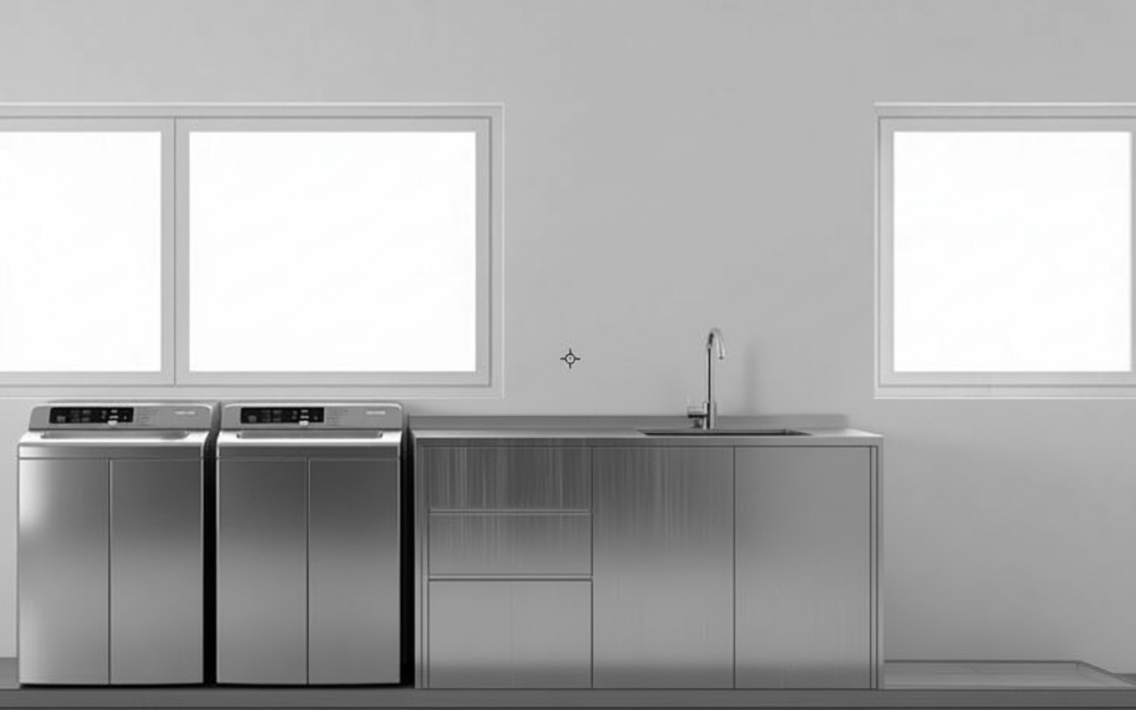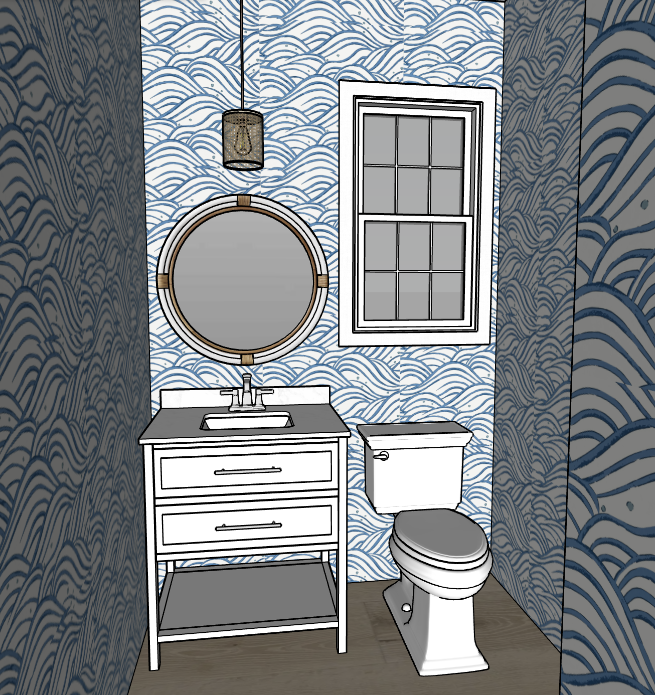 keep the integrity of the wallpaper shown on the walls and colors on all surfaces create a reflective surface in the round mirror above the sink light sources are natural light from the window and incandescent light from the pendant hanging above the mirror and sink