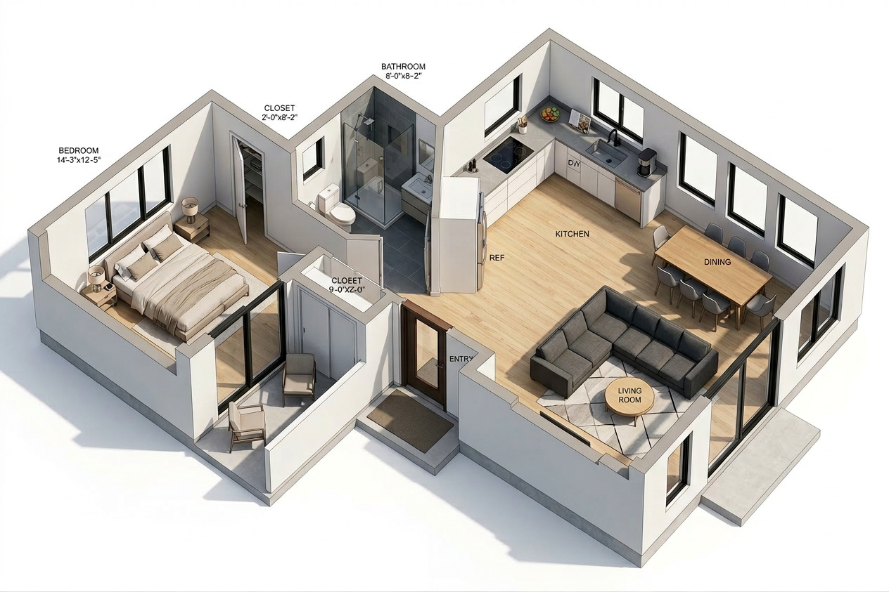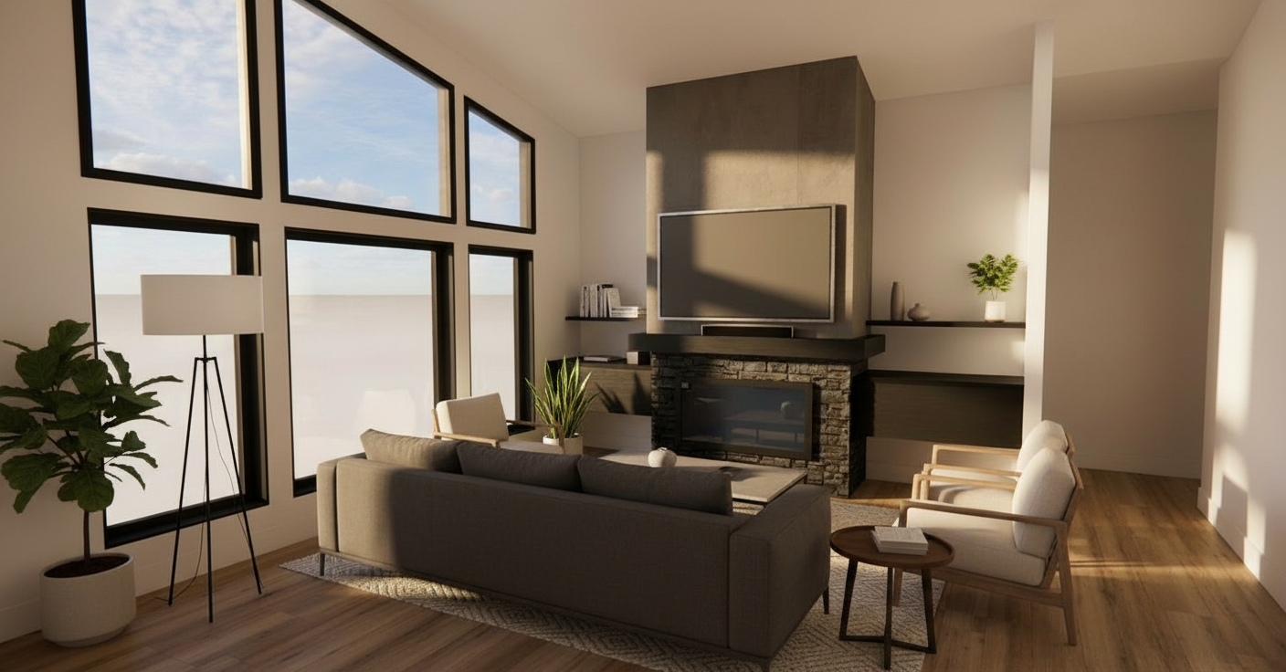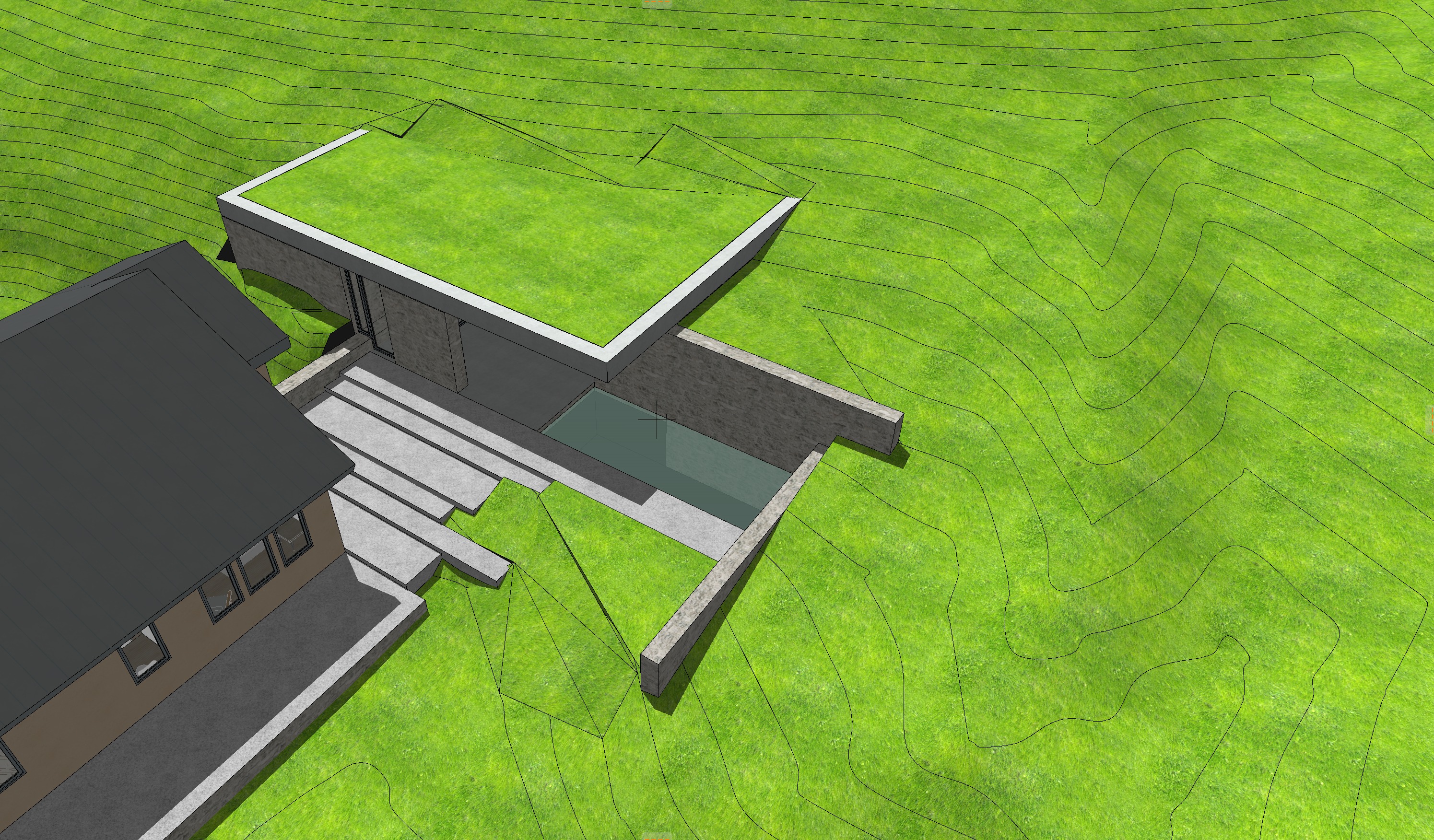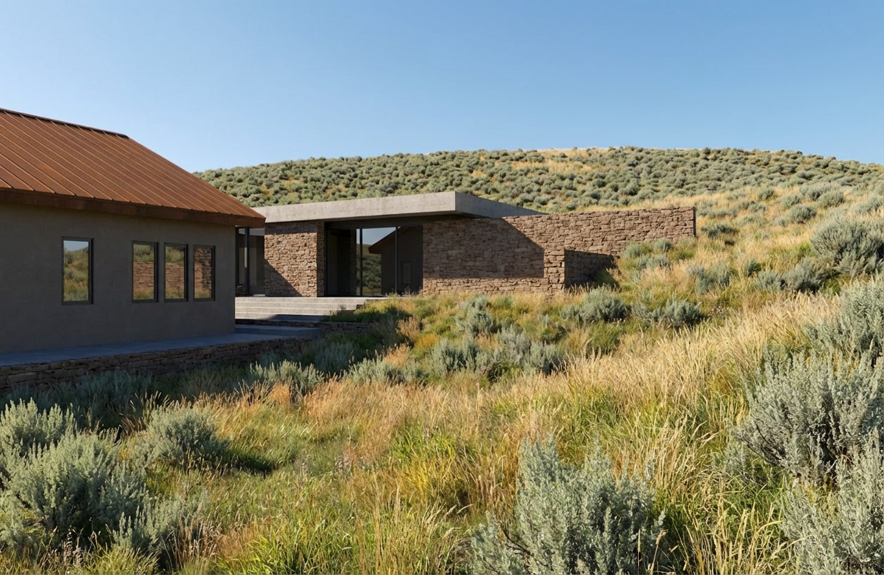 landscape hillside with sagebrush and tall wild grasses brown drystack stone walls corten standing seam metal roof on gable roof only concrete texture on fascia at flat roof green roof on flat roof section