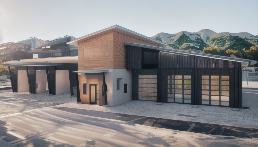 render a modern car wash building with a sleek contemporary design the structure features corrugated metal siding in shades of slate gray and charcoal with large glass doors reflecting light the roof is a silver metallic color complementing the overall industrial look the surrounding pavement is a smooth clean asphalt in deep gray enhancing the sleekness of the design the atmosphere is bright and clear with a crisp blue sky to emphasize the modern architecture and bring out the subtle textures in the materials the vertical corrugated metal above the auto bays is galvanized the metal behind the letters is vertical galvanized corrugated metal the metal above the office area is charcoal gray corrugated metal horizontal continue using this current image