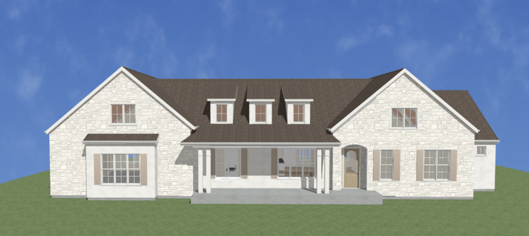 a french country cottage with light stone and creamy stucco a brown shingle roof with wood shutters pine trees and mountains scattered behind the house a manicured lawn a covered porch a soft blue sky with white clouds that softens the scene