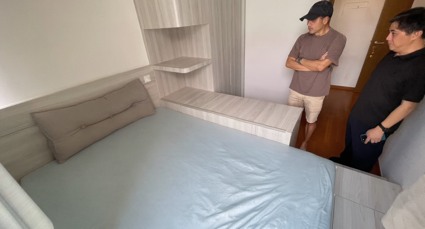 please remove cabinets and redesign this master bedroom with modern scandinavian interior