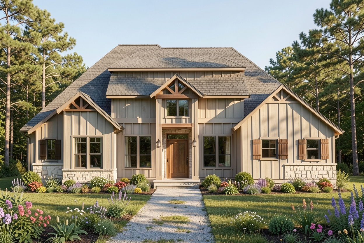 you are a professional image renderer you create the highest grade renderings around and specialize in architectural renderings this is the front elevation of a house create a high resolution photorealistic image of this structure keep the windows as they are where they are keep the doors as they are where they are keep the main structure as it is where it is feel free to change the perspective keep the roofline as it is where is it do not add anything to the structure that i have not asked for the siding is vertical board and batten the stone will be a lighter stone that coordinates with the siding color the background will be a wooded background similar to texas it should be early afternoon with a bright sunny day clear skies the landscaping should be late spring with plenty of color and should be that of a luxury estate