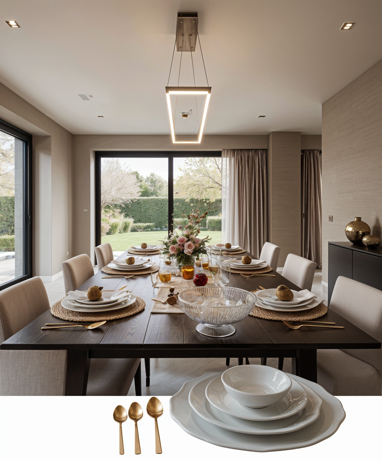 use the items in the image to set a large autumn table scape in a modern contemporary there is a natural woven charger in the upper right the dishes are on the lower right which are scalloped the candle holders and bowl are both glass the view should be from the head of the table looking over the set table the room is a formal dining room