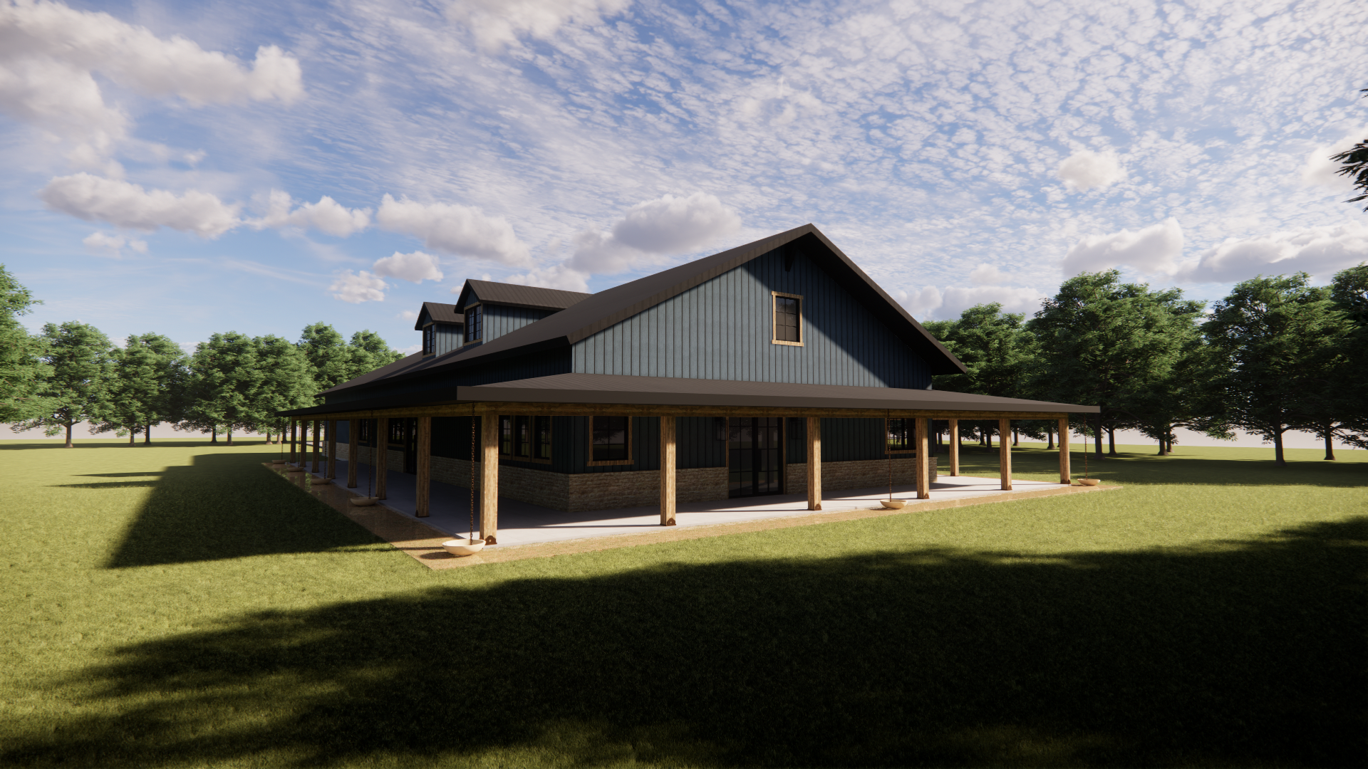 photorealistic architectural rendering of a large modern ranch style barn house located in weatherford texas maintain the exact building geometry rooflines dormers porch layout column spacing and massing exactly as modeled do not modify the architecture proportions or layout exterior materials exterior walls clad in deep blue standing seam metal wall panels matte finish with crisp vertical seams and subtle metal reflectivity panels should appear as real architectural metal siding with straight seams and natural shadow depth roof finished in matte black standing seam metal roofing the roof color must be solid black metal not blue and not gray standing seam roof panels must be perfectly straight rigid and evenly spaced running from ridge to eave with parallel seam lines and consistent spacing 16 18 inch panels roof planes should appear perfectly flat and planar with no warping rippling bending or distorted seam lines the roof should look like professionally installed standing seam metal roofing panels with crisp mechanical seams and clean straight panel alignment porch columns beams trim and gable accents made from warm natural cedar wood rich amber brown tone with visible wood grain and natural variation base of the building clad in dark texas ranch moss rock stone veneer large irregular fieldstones with deeper brown charcoal gray and weathered tan tones stones should appear rugged and dimensional with deep recessed mortar joints and strong shadow lines typical of heavy ranch style moss rock construction in north texas avoid light cream or pale limestone tones windows with dark bronze or black frames rendering quality ultra realistic architectural visualization using physically accurate materials high resolution textures global illumination realistic reflections and natural shadows professional architectural photography style using a 35 50mm architectural lens environment and site set in rural parker county weatherford texas terrain with gently rolling ground native grasses limestone soil tones and scattered live oak and post oak trees natural ranch landscape with minimal landscaping and realistic ground textures lighting warm late afternoon texas sunlight with soft shadows under the porch and balanced sky exposure material realism materials must appear highly tactile and realistic visible cedar grain rugged dark moss rock stone with deep shadow lines and crisp metal standing seam panels important clarification the walls are blue standing seam metal while the roof is matte black standing seam metal roofing the roof seams must be perfectly straight evenly spaced and parallel with no warping or waviness and the roof surfaces must appear flat and planar like real metal roofing panels surfaces should look like real construction materials on a completed ranch house in texas not cgi