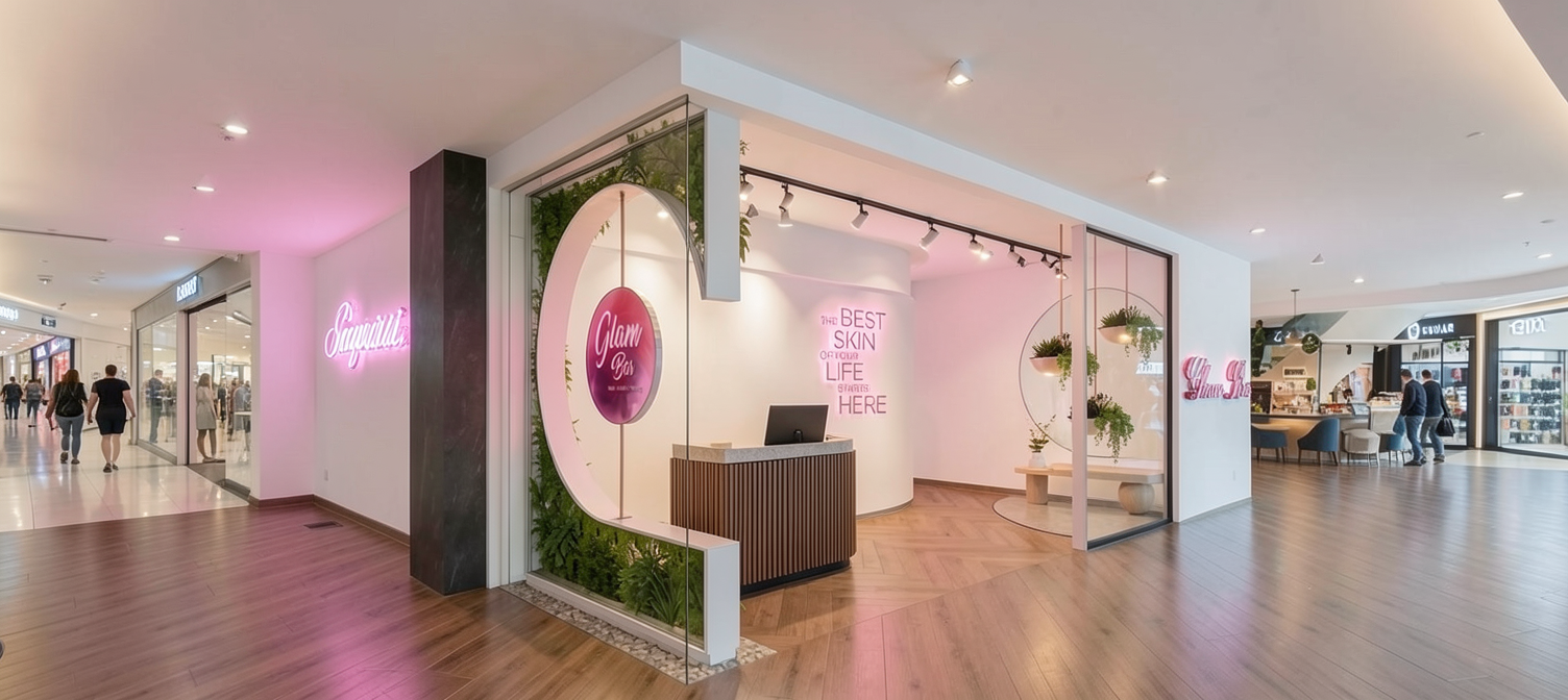 inside a mall white plain ceiling turn on logo glam bar neon light pink on the wall matt wood floor granit tile for mall floor
