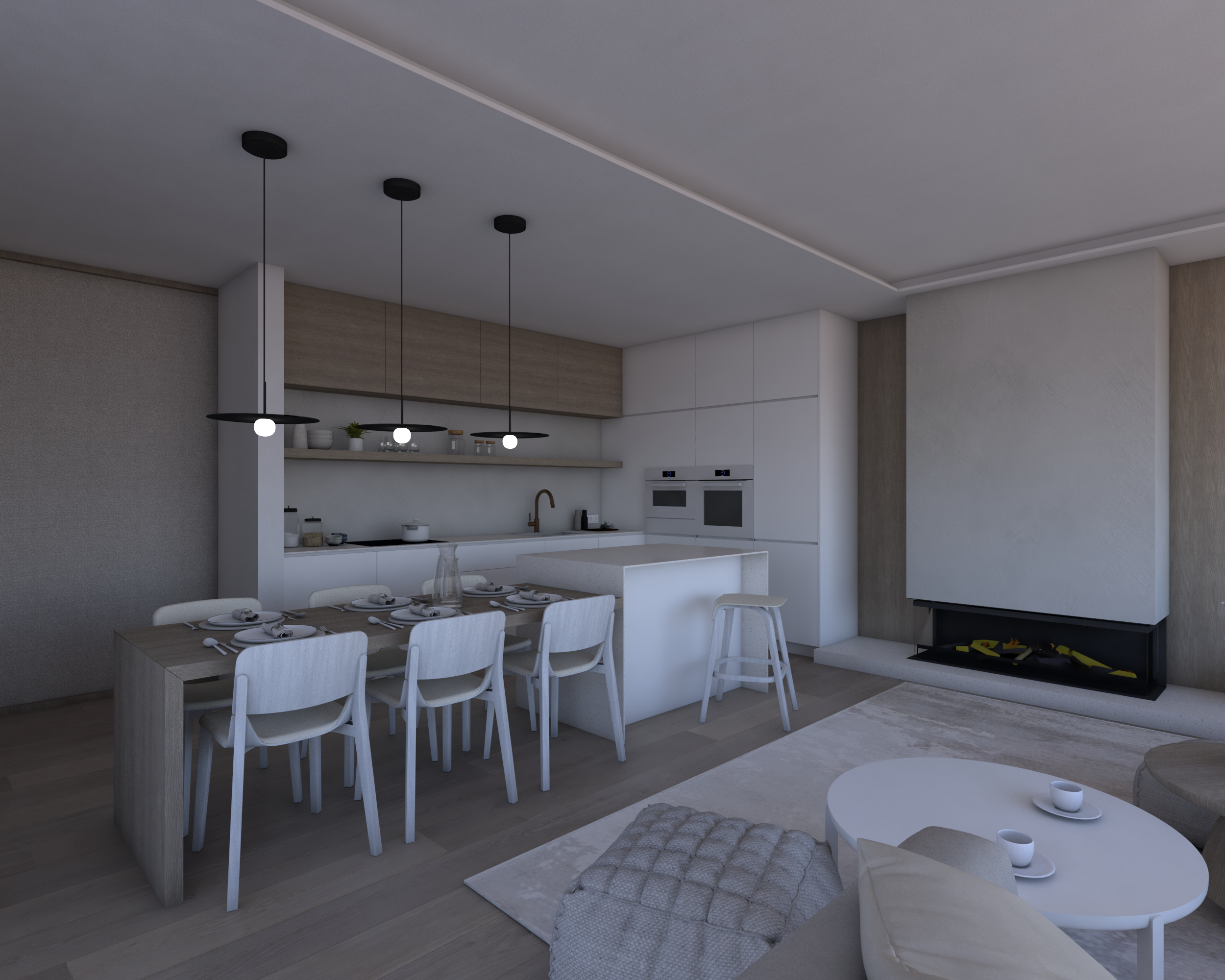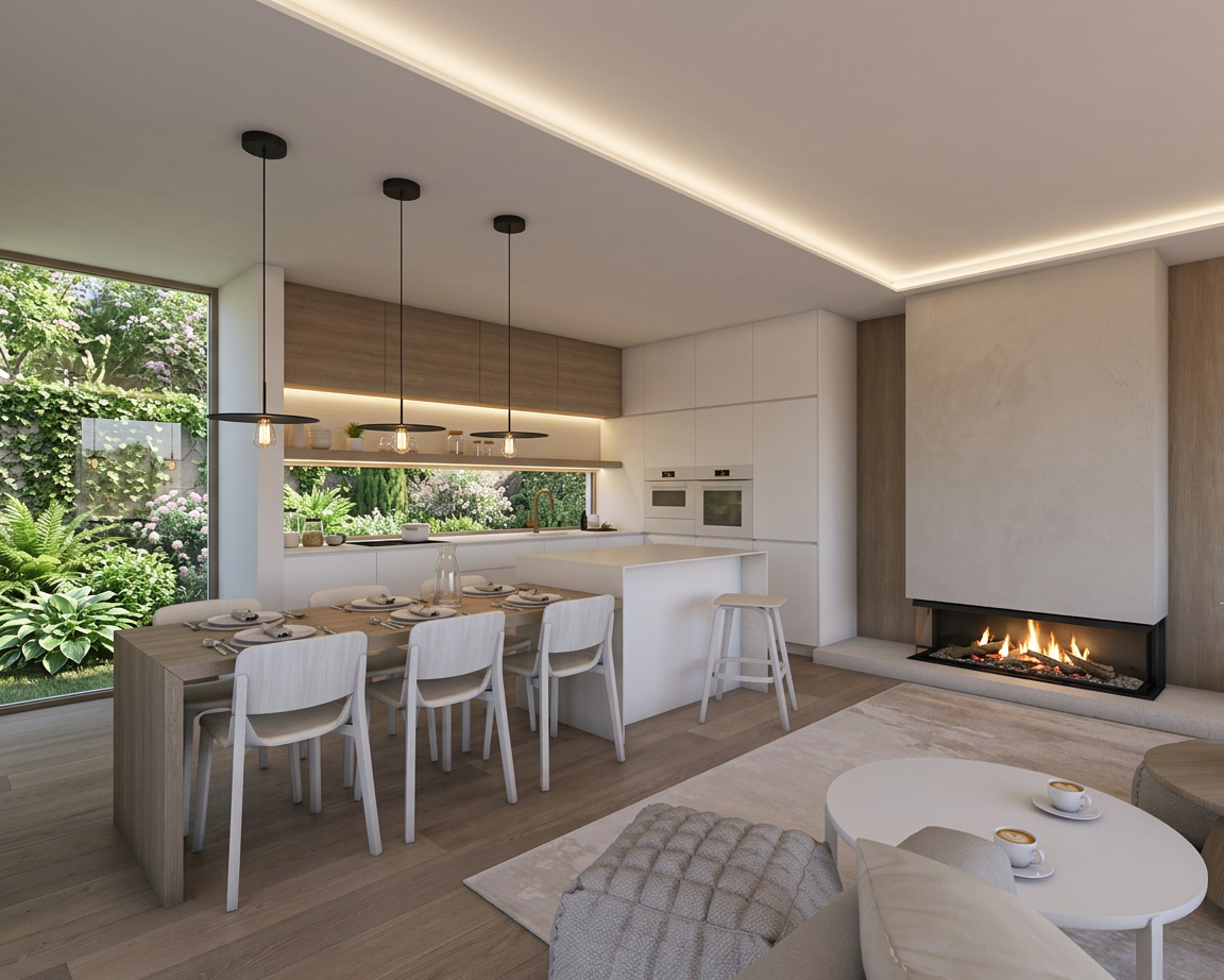 photorealistic interior soft light do not change the material design do not add any elements shelf backlit ceiling backlit at the edge photorealistic fireplace with fire ceiling lit at the edge