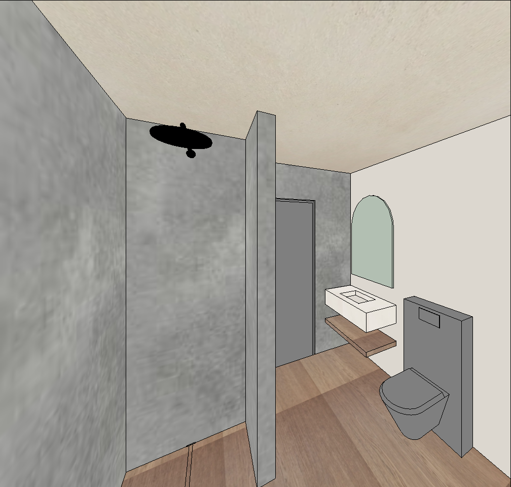 flooring to be tiles and walls to be tiles as well in travertine toilet white and sink white shelf under sink in oak color