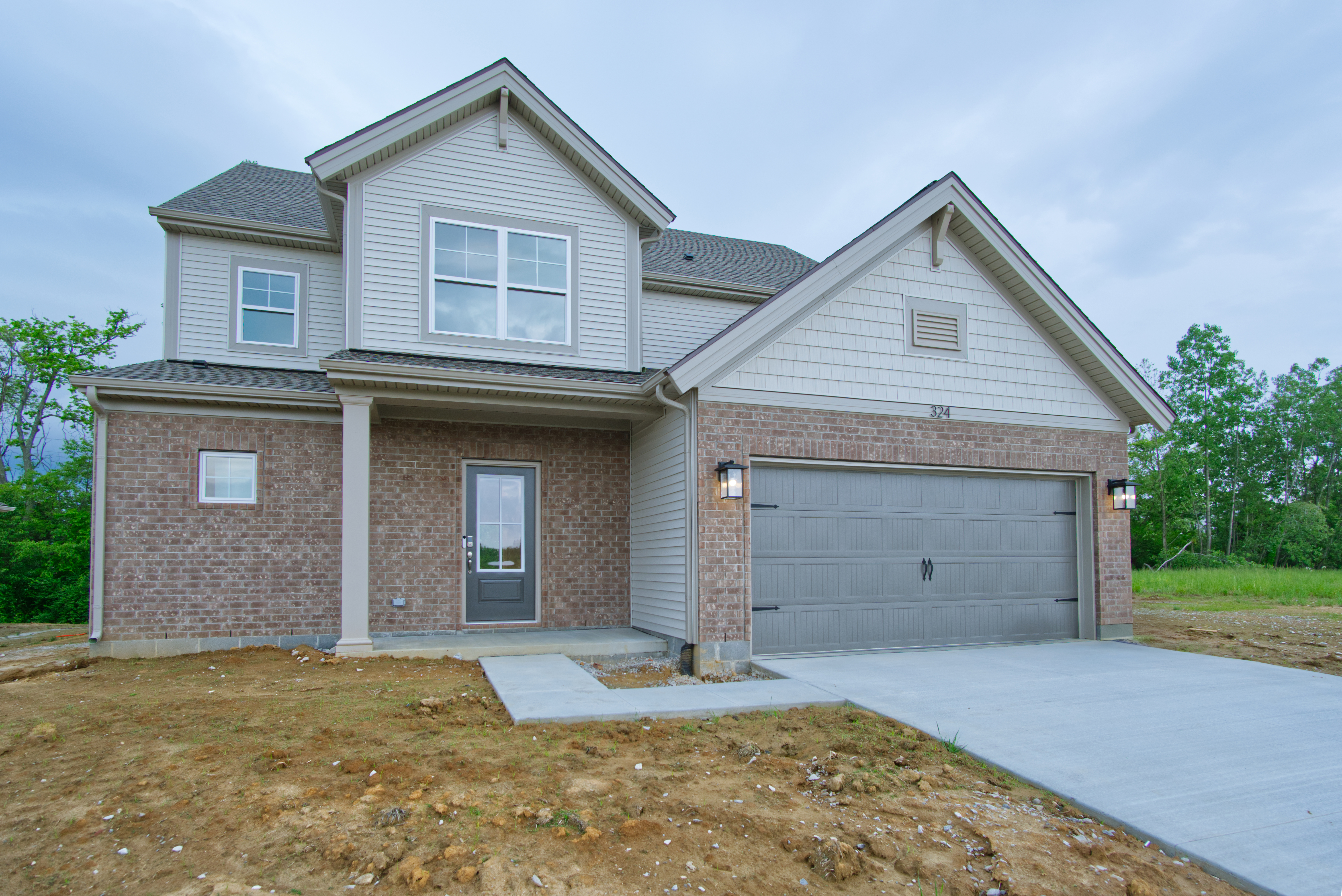 create landscaping on the facade of this home with brown mulch and young shrubs make the grass green and well kept