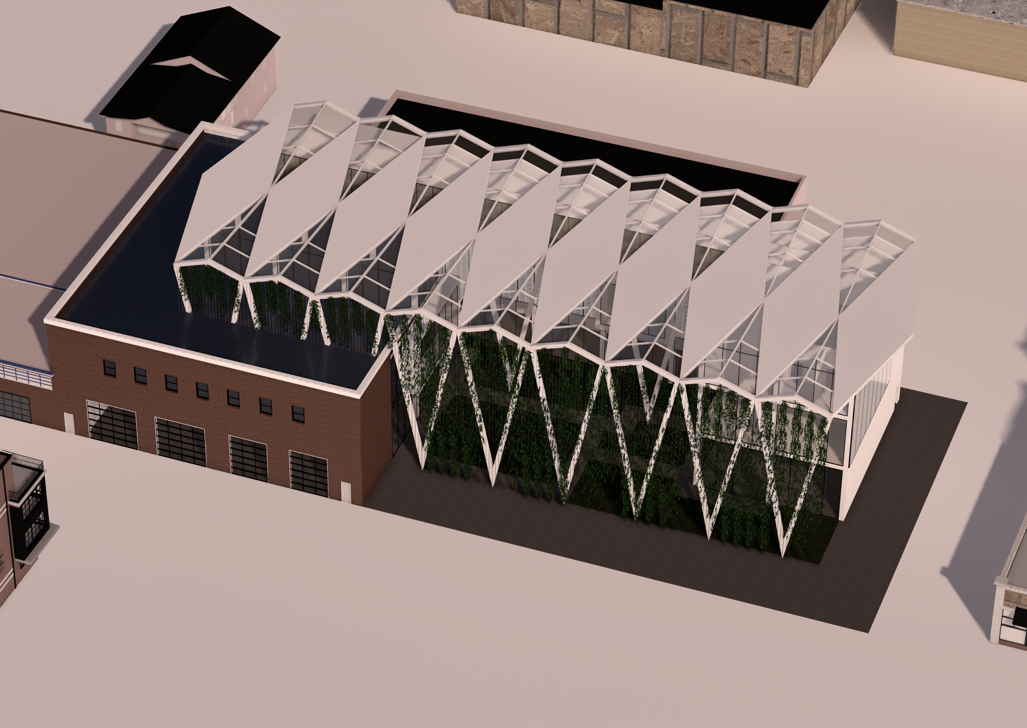 render this axonometric view as a clean diagrammatic performance visualization do not change the camera angle scale proportions or geometry maintain the existing folded roof structure v shaped columns vegetated cable fa ade and retained brick warehouse exactly as shown increase clarity and material definition roof panels should read as translucent kalwall or polycarbonate with soft diffuse daylight structural steel should appear matte white and crisp vegetation should be realistic but controlled evenly distributed and not overgrown brick warehouse should remain subdued and secondary lighting should be neutral daylight slightly overcast with soft shadows and no dramatic contrast background context should remain minimal and desaturated to emphasize building performance elements overall style should be architectural instructional and diagram ready suitable for adding performance callouts related to daylighting shading and passive environmental strategies