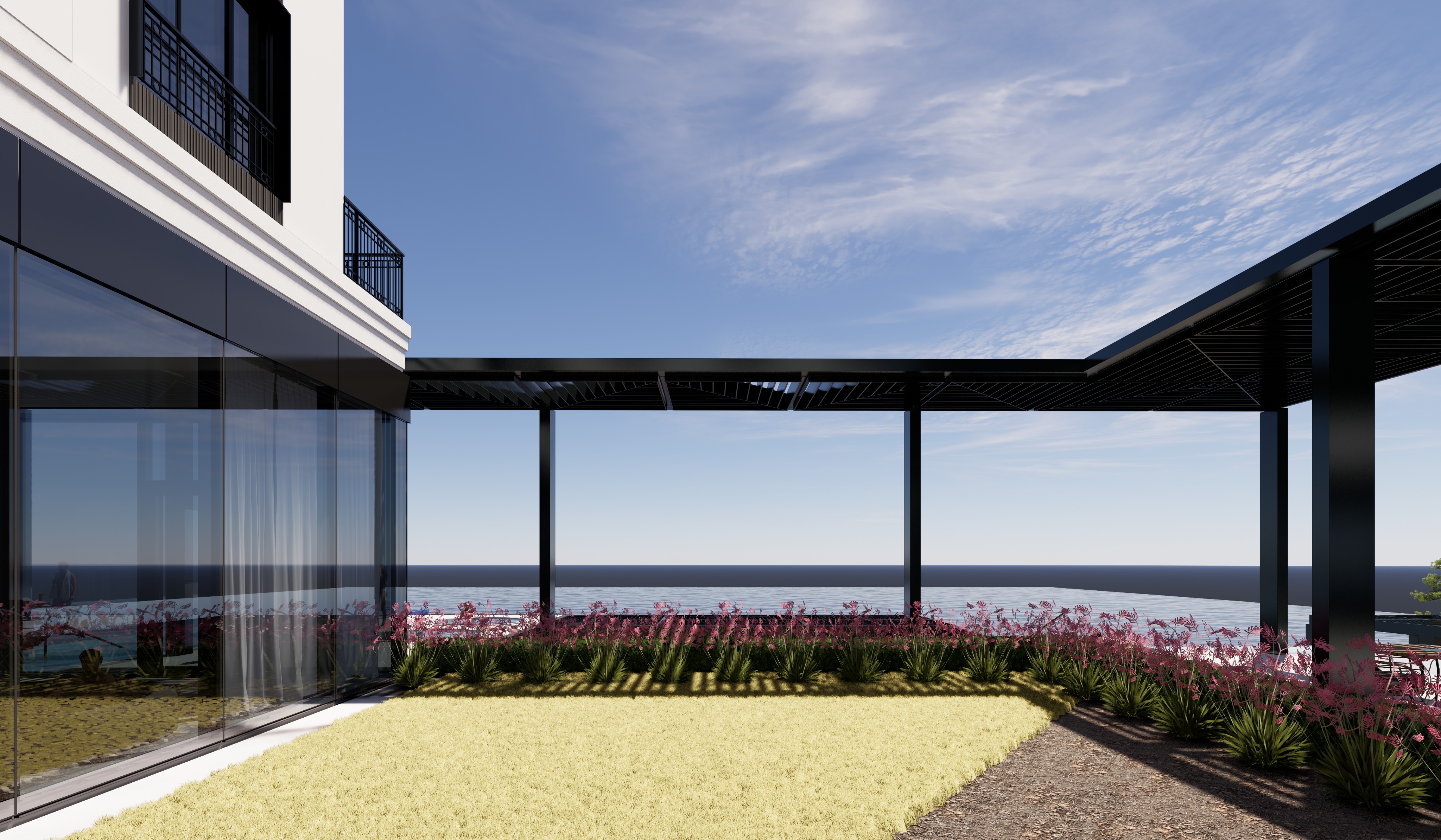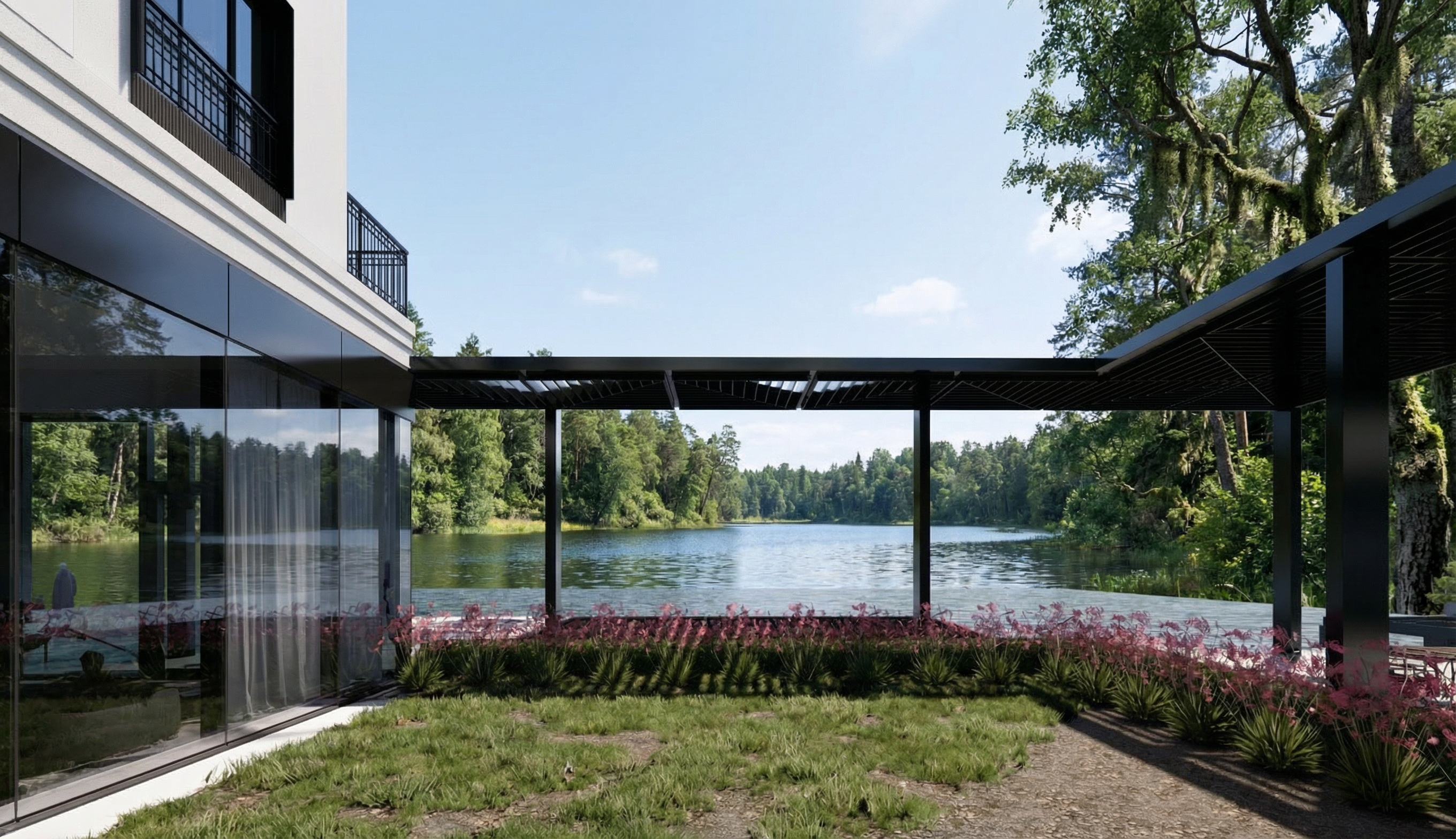 transform this image into a hyper photorealistic architectural visualization no trees in the foreground keep foreground completely clear of any trees or large vegetation replace all non realistic materials with lifelike versions maintaining the dominant color palette add natural subtle sheen and glossy highlights on metals glass wood surfaces create realistic textures on concrete plaster and fabrics with micro details change background to serene lake region surrounded by dense forest enhance surrounding environment to ultra realistic quality while preserving exact structure and shape of bushes trees grass and lake detailed bark textures with moss on trees natural leafy density variation on shrubs short grass blades mixed with soil patches reflective lake surface with gentle ripples realistic water depth and shoreline details preserve natural forest floor under trees as woodland litter and earth leaf litter pine needles moss patches soft brown soil texture blending seamlessly add precise environmental reflections in every glass pane capturing surroundings bright high key lighting throughout with even daylight illumination no harsh shadows clear blue sky with soft clouds ultra detailed 8k photorealistic render professional architectural photography style nice grass