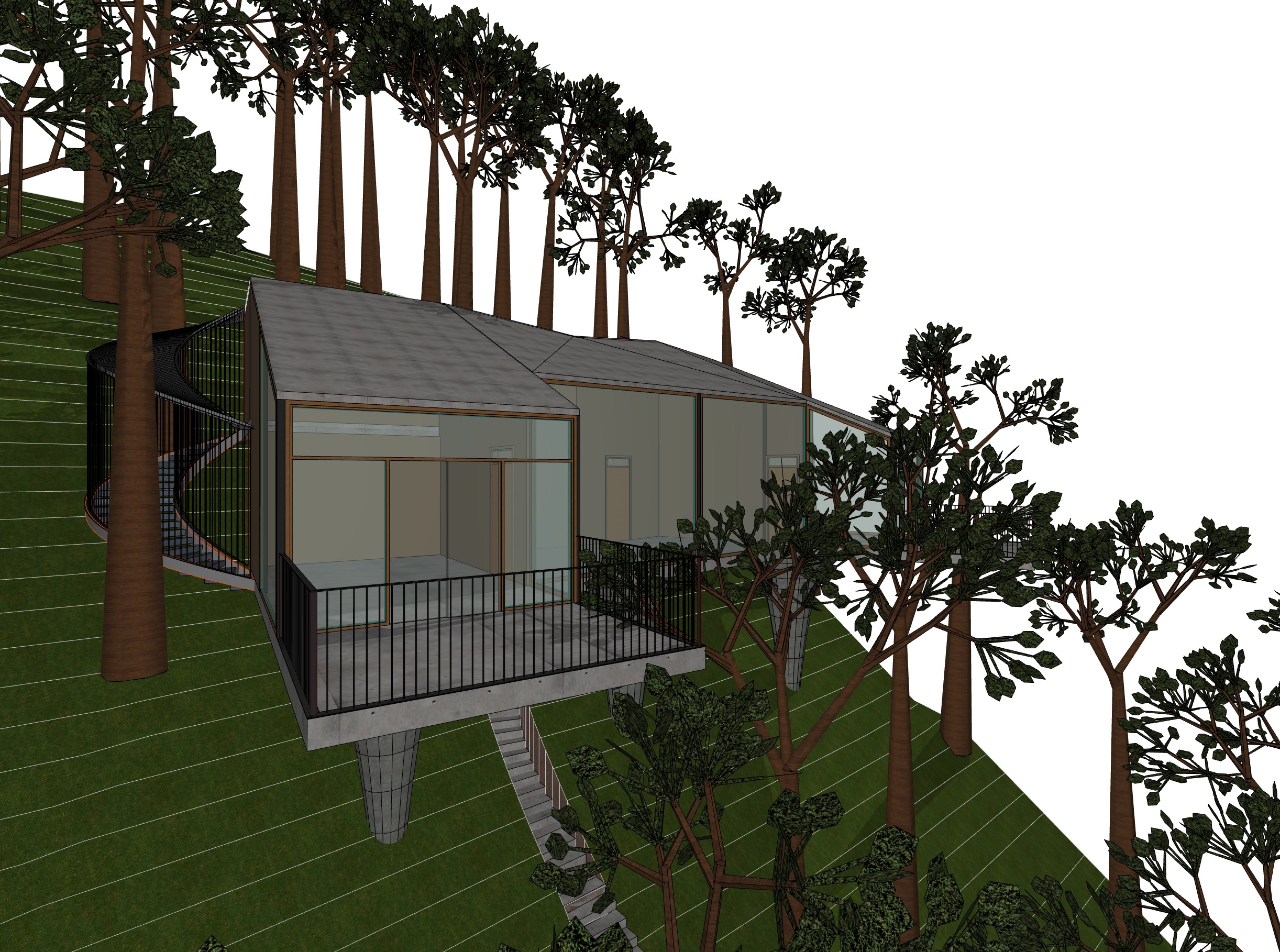 an ephemeral treehouse structure built with timber with large glass windows and lightweight steel framing is perched on a steep hillside among a lush forest canopy the building is elevated on slender concrete pillars featuring a minimalist balcony with black railings and a stone path winding up the slope surrounding the architecture are tall trees with dense foliage while bright sunlight filters through the leaves under a clear sky populate the interior with furniture and a person standing on the balcony the atmosphere is mysterious with a light mist moving across the space the sky is a moody sky with bright storm clouds