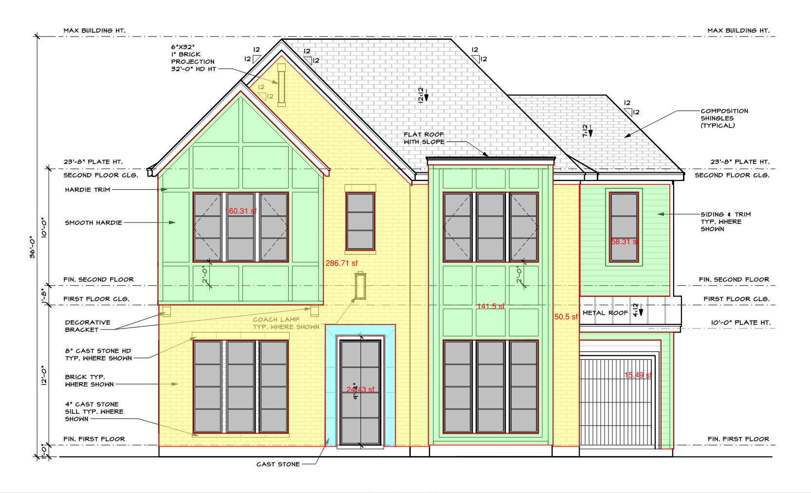 make all the yellow highlighted brick areas off white colored brick make all the green highlighted trim areas dark grey and make the blue highlighted cast stone cream in color