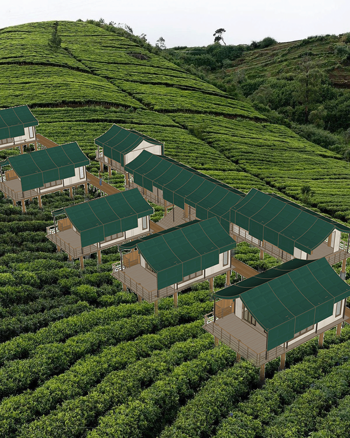 enhance and develop the raw 3d drawing into a realistic render maintain the original building massing angle and all existing elements the site is a vibrant tea plantation facing a rural balinese farm road with scattered clove trees acting as natural visual barriers between the buildings the architecture features tent roofs and stilt structures making the buildings float above the tea terraces add subtle human activity a few people casually playing and walking around the tea plantation and a couple standing on the balcony of one of the stilt buildings emphasize warm light natural textures and the harmonious integration of the elevated architecture with the layered green landscape