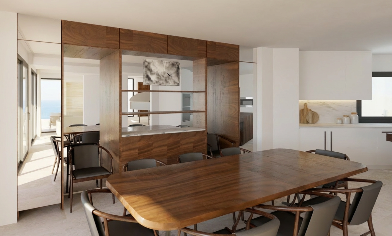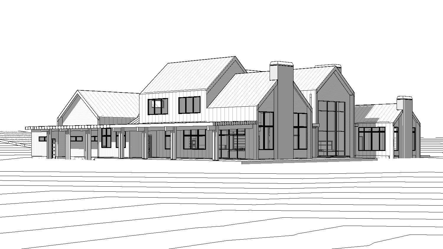 back view of a clean modern architectural exterior home rendered in cinematic vibrant golden hour lighting home in a winery setting with streaks of light coming through trees in the surrounding area warm glow and reflections off of the windows blue sky shining modern siding green manicured landscape around structure with gardens and patches of grass black standing seam metal roof prominent trees and winery in the background high fidelity photorealistic visualization crisp shadow falloff refined facade geometry soft atmospheric depth premium architectural photography mood ultra clean composition and materials black window trim flat roof photorealistic render
